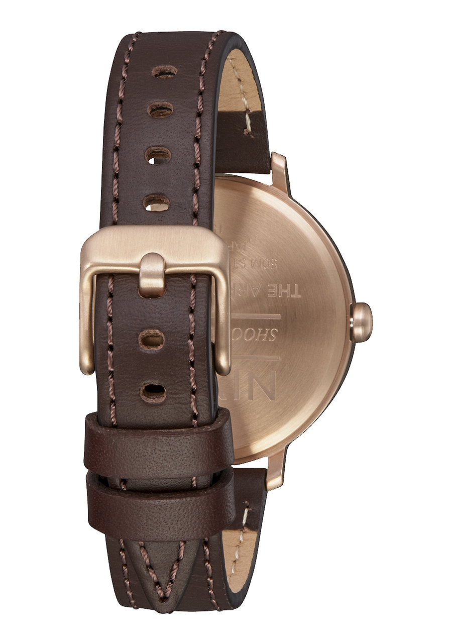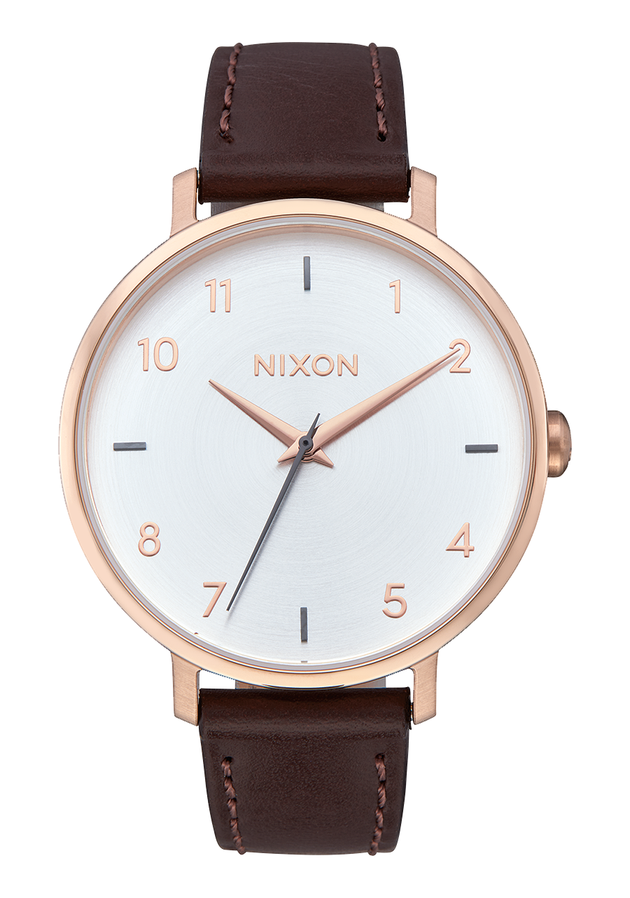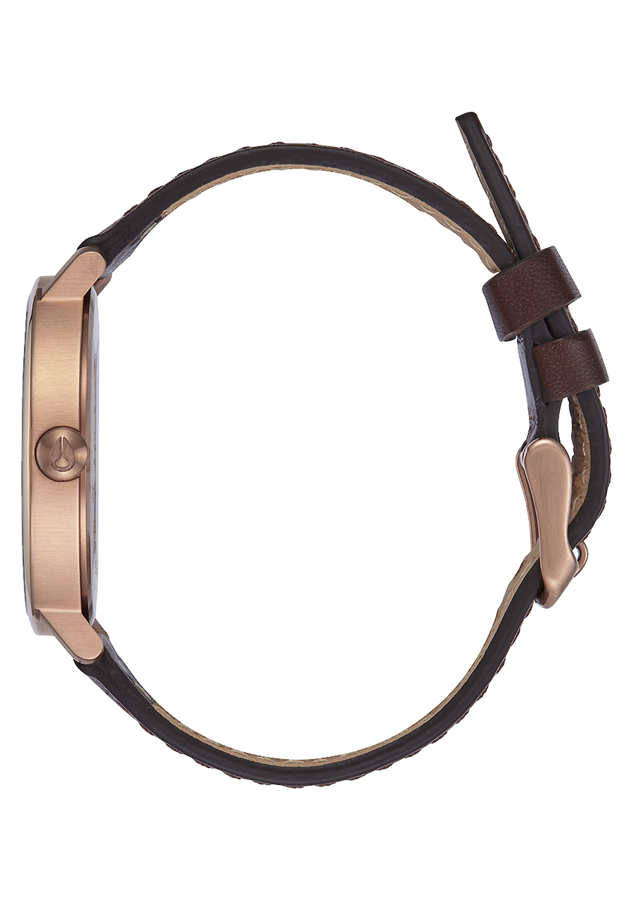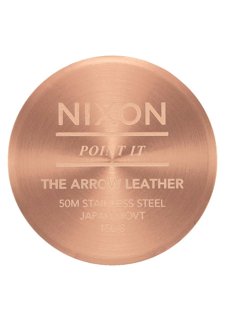 Ce cadran comprend un logo Nixon appliqué et des index ainsi que des chiffres imprimés et des aiguilles moulées sur mesure.