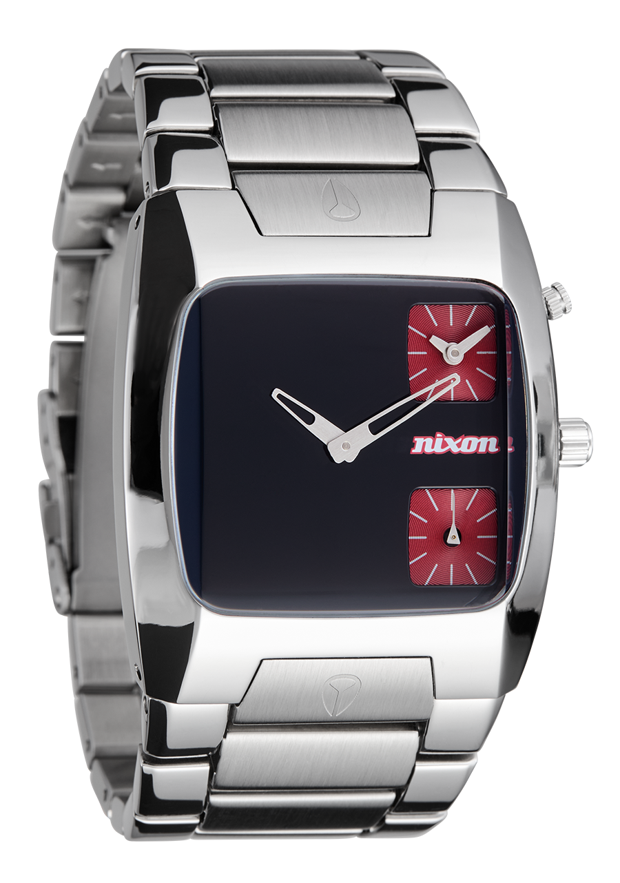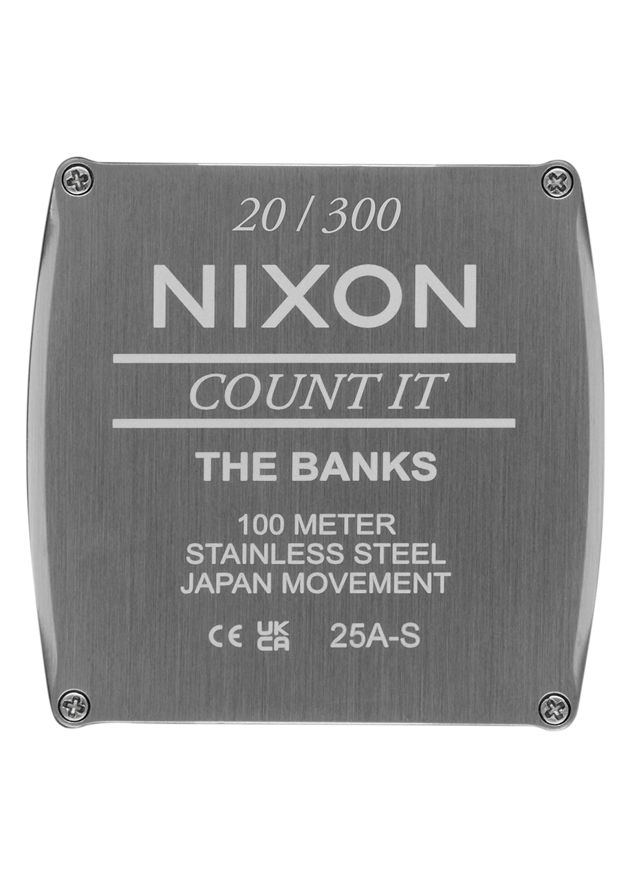 La Banks est équipée non pas d'un, ni de deux, mais de trois mouvements de montre distincts pour chaque cadran et sous-cadran de la montre. Le logo script original Nixon est placé entre les deux sous-cadrans pour un effet nostalgique.