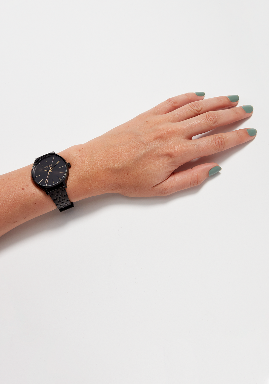 Aiguilles moulées sur mesure, y compris une trotteuse en forme de flèche. Index imprimés et traitement soleillé sur le cadran.