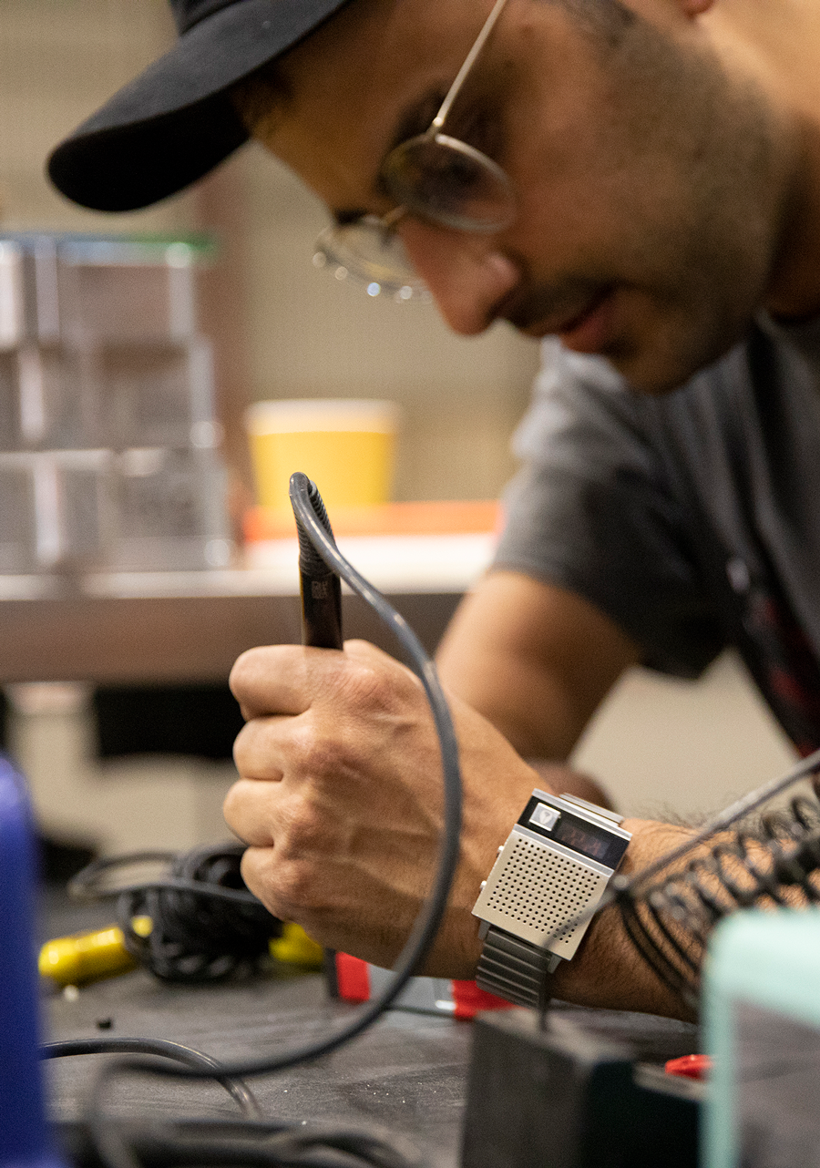 Boîtier en acier inoxydable moulé par injection sur mesure de 34 mm avec cache haut-parleur en acier inoxydable perforé et poussoirs, avec port de charge micro USB.