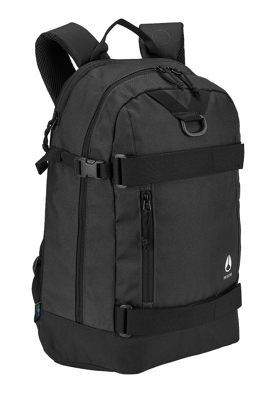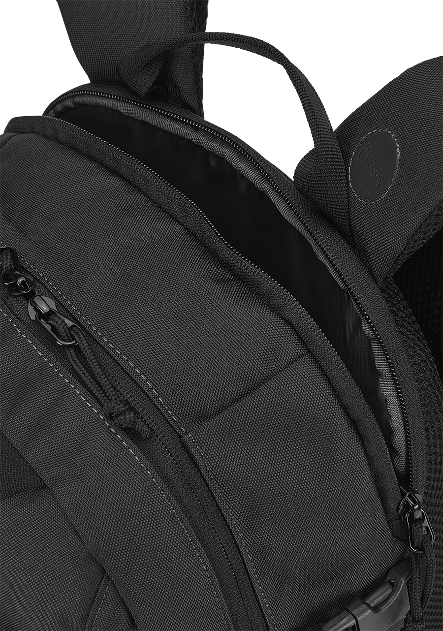 Grand compartiment principal avec poches internes d’organisation. Housse pour ordinateur portable (15") avec accès par fermeture éclair externe. Sangles externes pour skateboard, poche pour bouteille d’eau, poche fourre-tout zippée et boucle multifonction. Petite poche amovible en maille attachée à la bandoulière, taille idéale pour un petit flacon de désinfectant pour les mains.