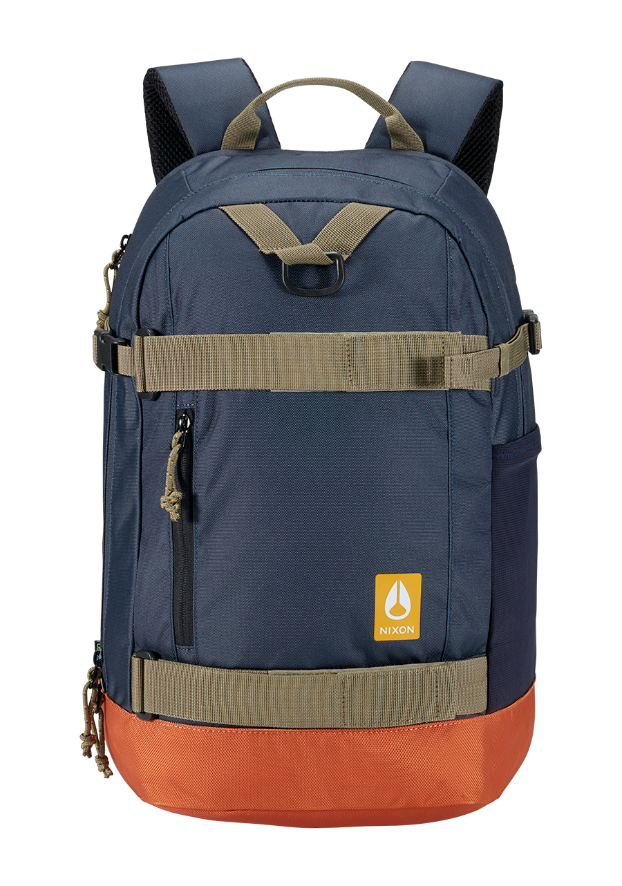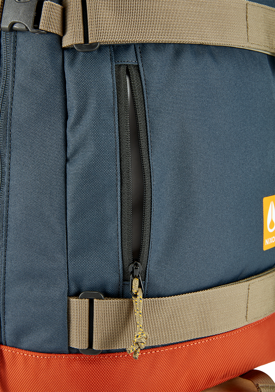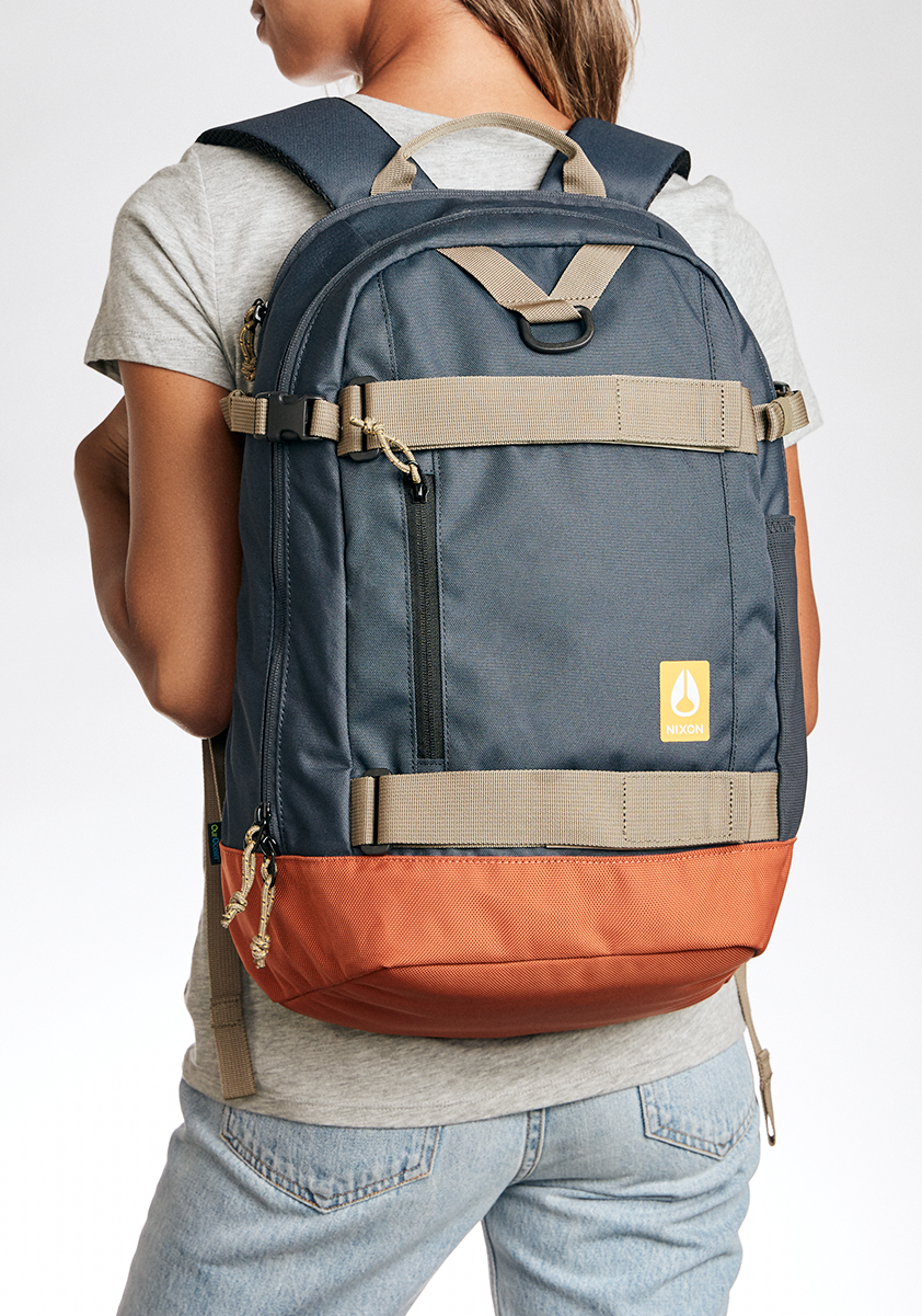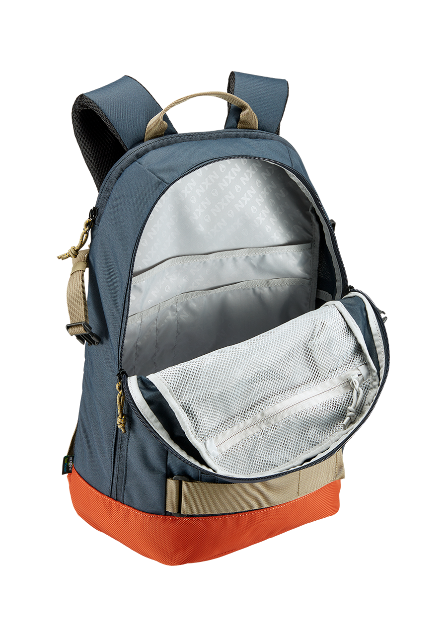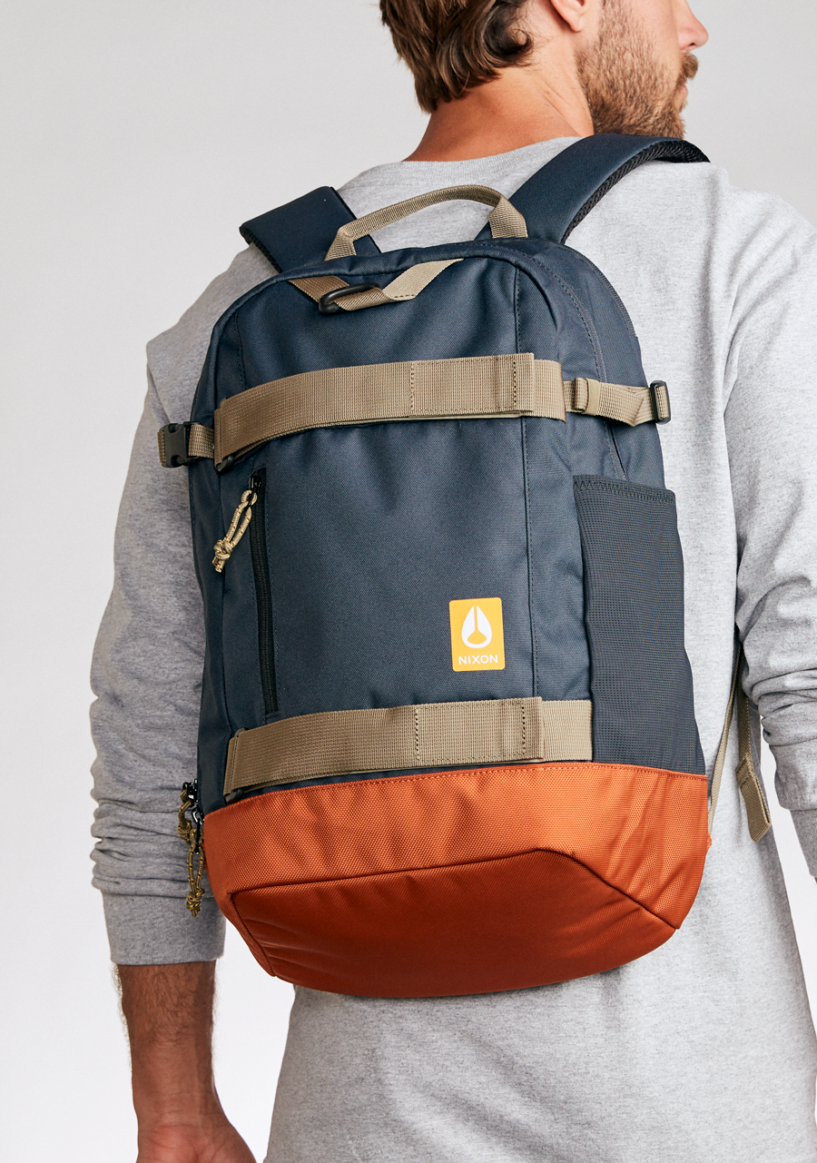 Grand compartiment principal avec poches internes d’organisation. Housse pour ordinateur portable (15") avec accès par fermeture éclair externe. Sangles externes pour skateboard, poche pour bouteille d’eau, poche fourre-tout zippée et boucle multifonction. Petite poche amovible en maille attachée à la bandoulière, taille idéale pour un petit flacon de désinfectant pour les mains.