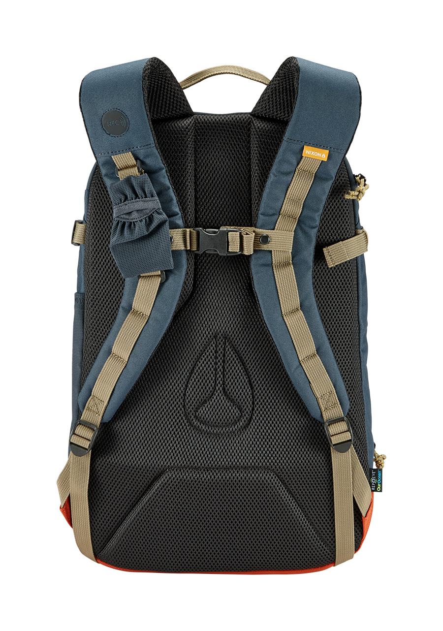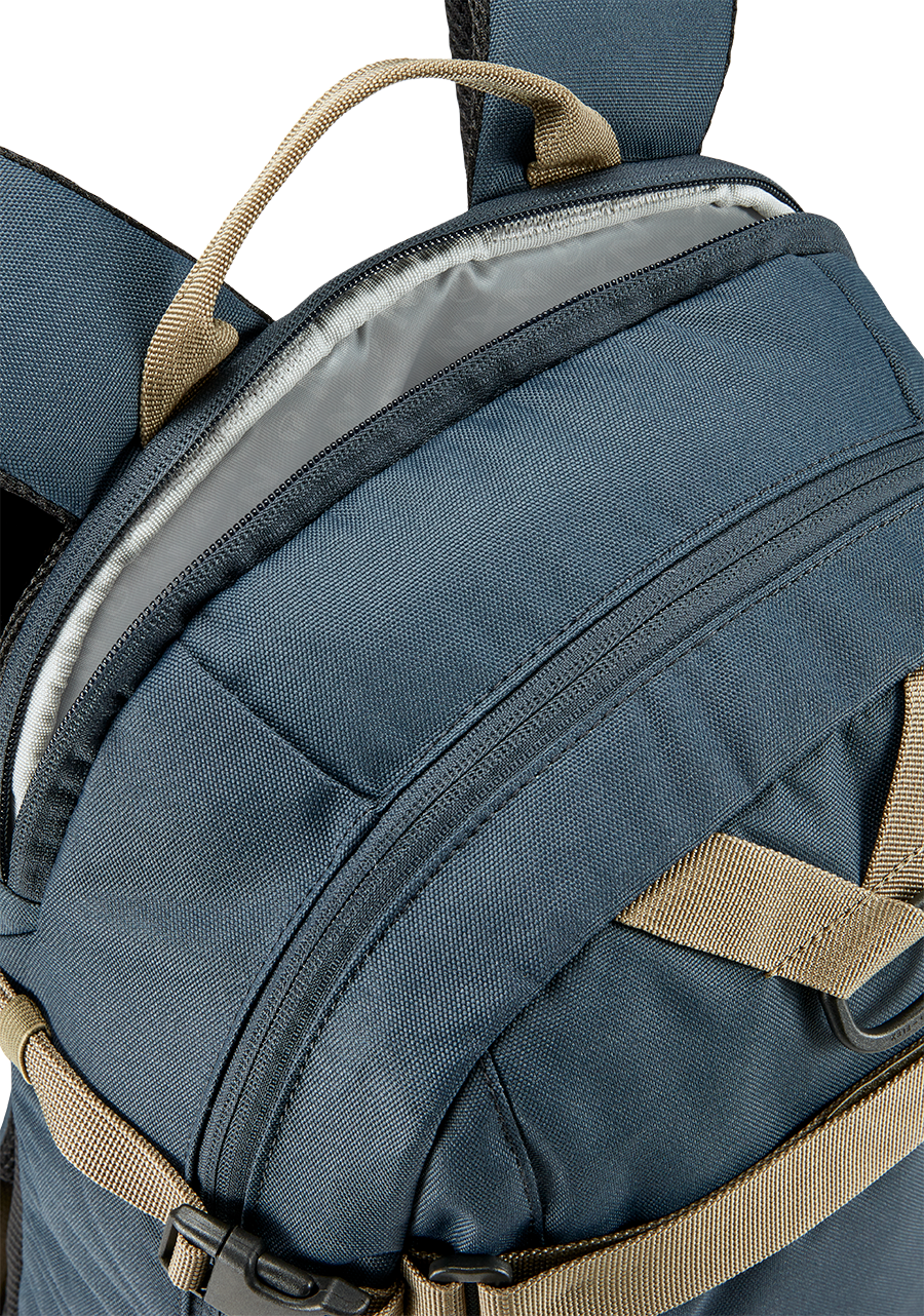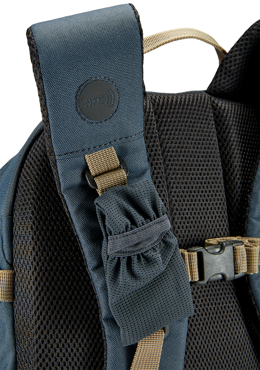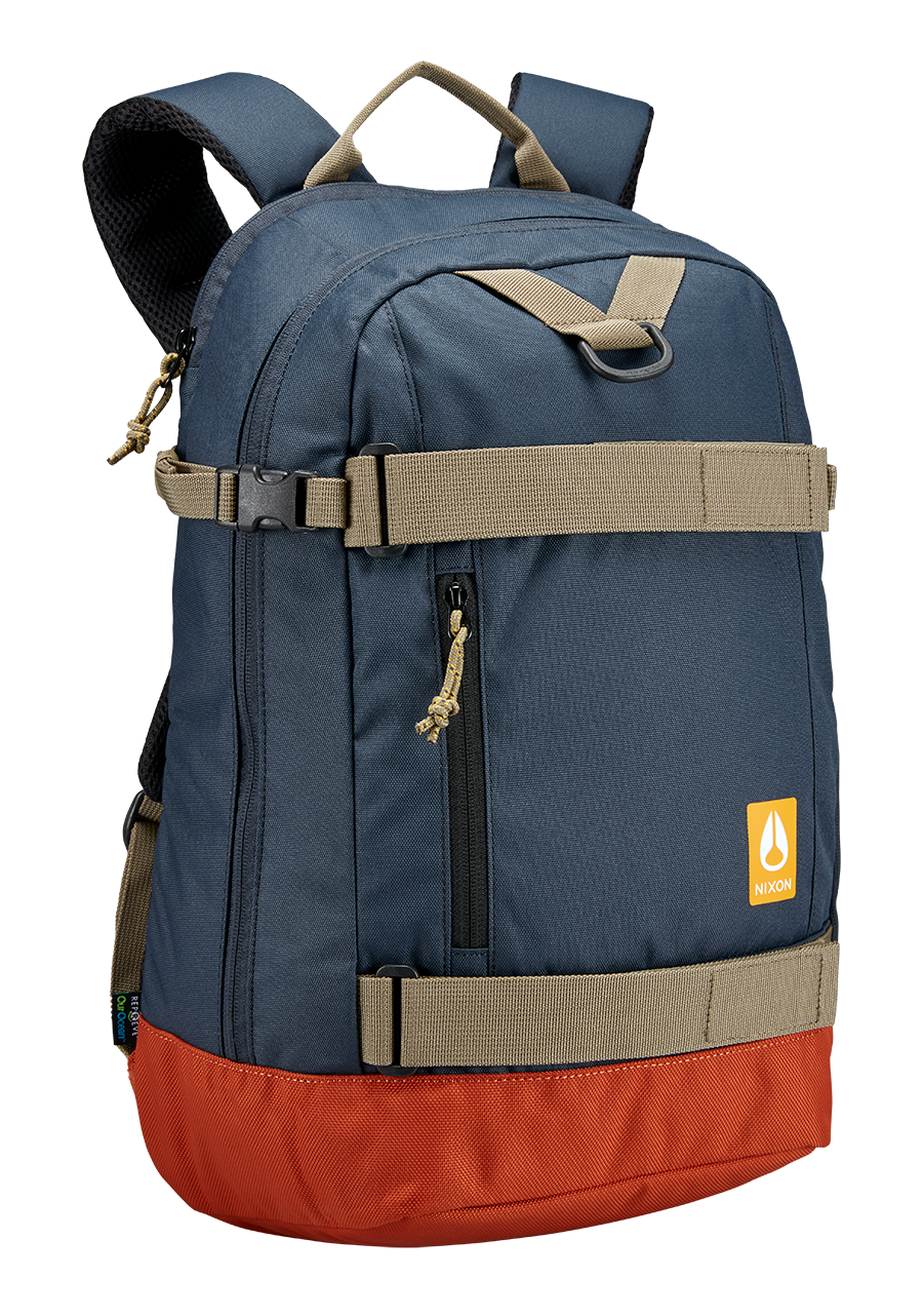 Grand compartiment principal avec poches internes d’organisation. Housse pour ordinateur portable (15") avec accès par fermeture éclair externe. Sangles externes pour skateboard, poche pour bouteille d’eau, poche fourre-tout zippée et boucle multifonction. Petite poche amovible en maille attachée à la bandoulière, taille idéale pour un petit flacon de désinfectant pour les mains.