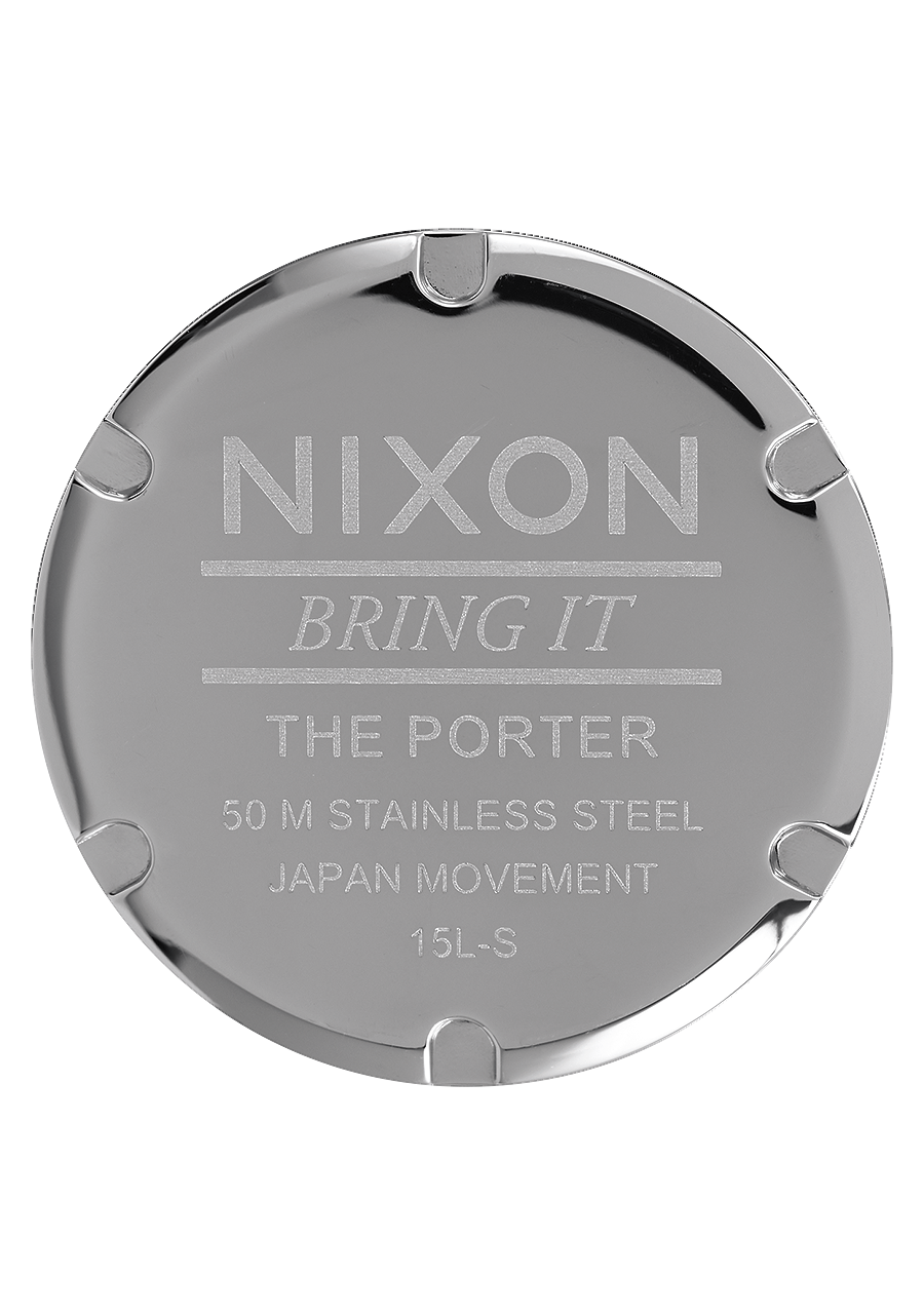 Le boîtier de la Nixon Porter Leather est en acier inoxydable personnalisé, tandis que le bracelet est en cuir. Pour prendre soin du bracelet en cuir, essuyez d'abord la poussière avec un chiffon en microfibre sec. Ensuite, humidifiez légèrement le chiffon et essuyez doucement toute saleté du bracelet. Enfin, laissez sécher le bracelet à l'air. Pour plus d'informations sur le nettoyage des bracelets de montres en cuir, visitez notre blog.