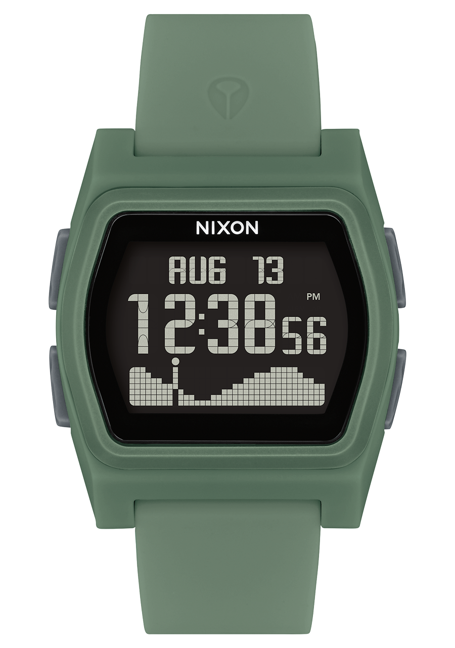 Module numérique personnalisé avec informations préprogrammées sur les marées pour 550 plages dans le monde. Fonctions incluant l'heure (12 ou 24 heures), la date, les données de lever/coucher du soleil, les marées passées et futures, double fuseau horaire, 3 types d'alarmes, minuterie, compteur de vagues, chronographe et rétroéclairage EL.