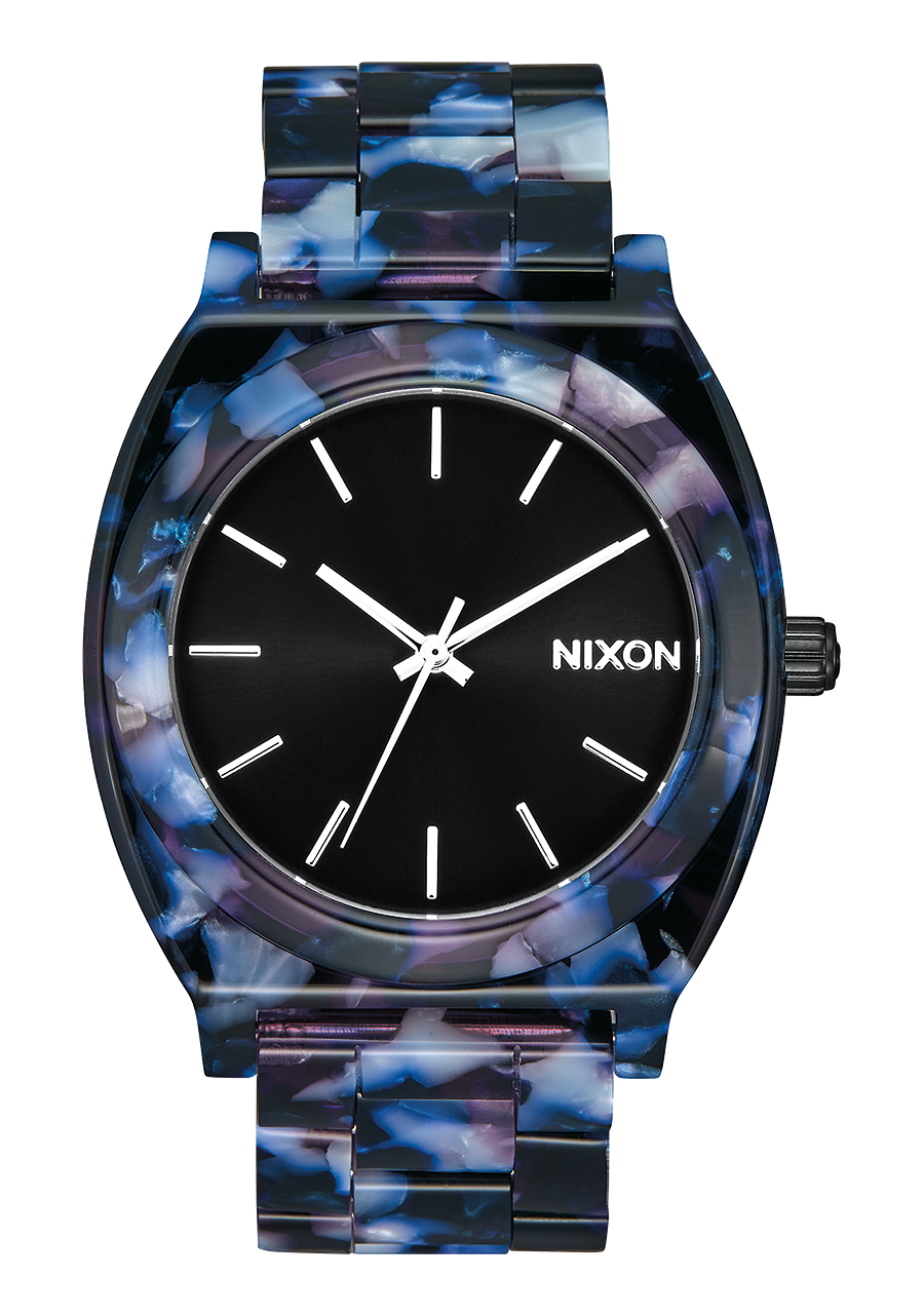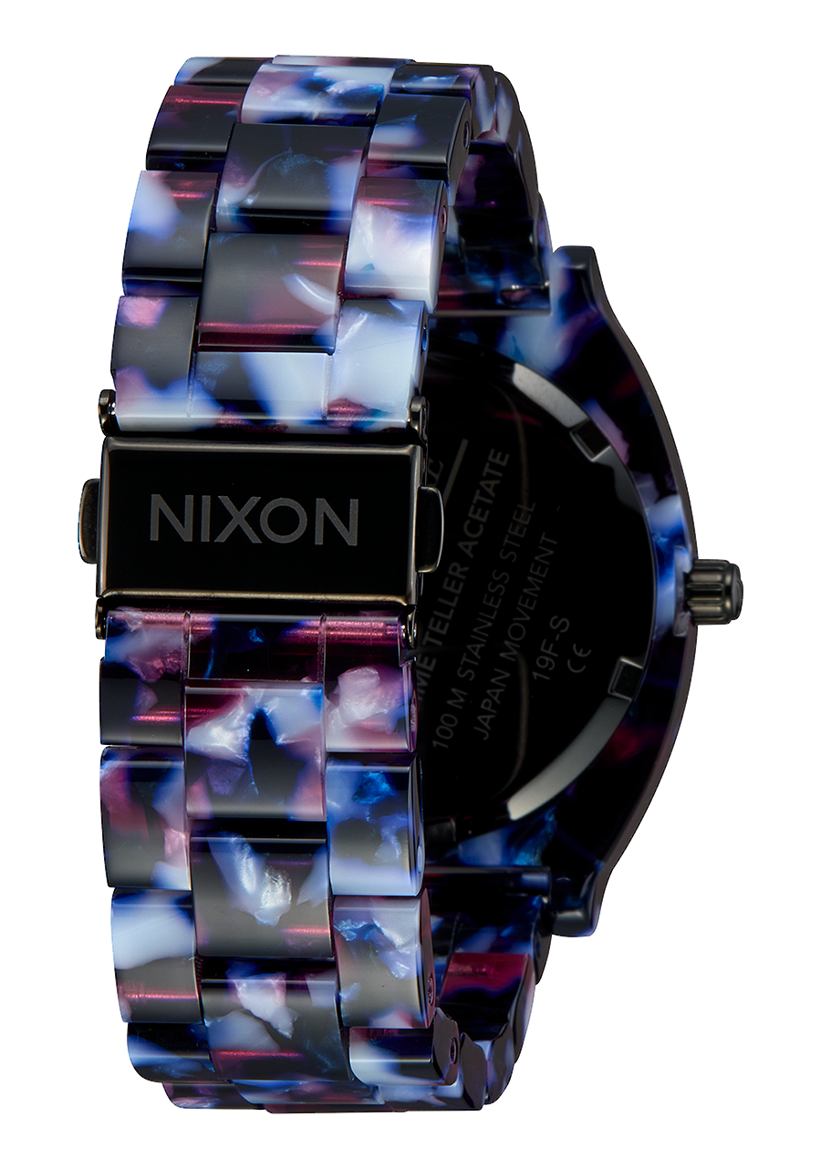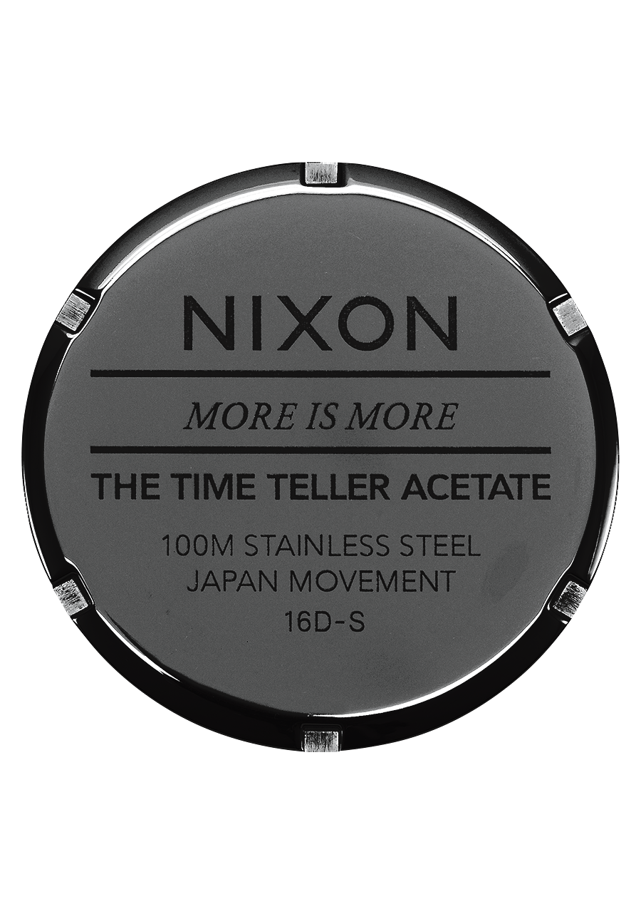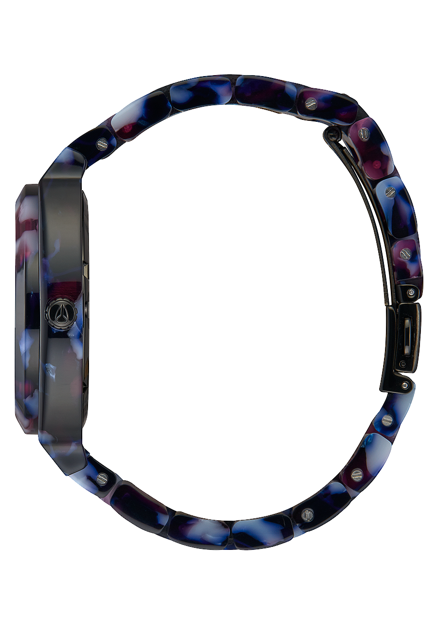 Boîtier en acétate fait main sur mesure de 40 mm et lunette fixe avec une étanchéité de 100 mètres / 10 ATM. Équipé d'un verre minéral durci, d'une couronne en acier inoxydable à triple joint, d'un fond de boîtier vissé en acier inoxydable et de cornes à goupille ressort.