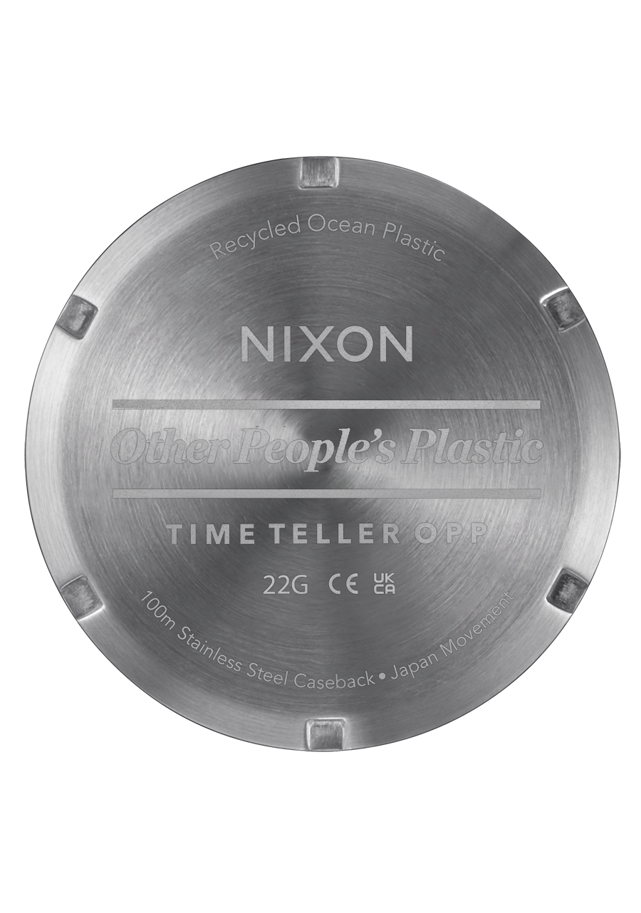La Time Teller OPP est fabriquée à partir de Plastique des Autres (OPP), ce qui fait référence à des matériaux plastiques recyclés, en particulier le plastique post-consommation qui finirait autrement en déchet. Cette approche permet à Nixon de réduire les déchets et de promouvoir la durabilité, en accord avec un objectif de créer des articles respectueux de l'environnement comme la montre Time Teller OPP.