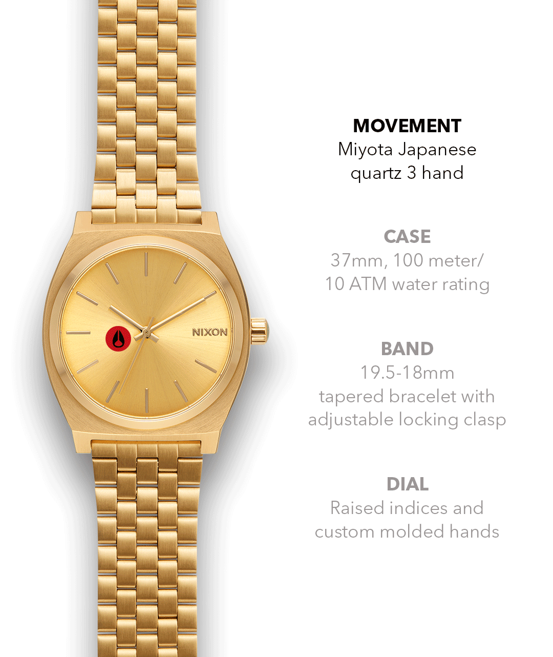 La montre Nixon Time Teller dispose d'un boîtier en acier inoxydable massif et d'un bracelet en acier inoxydable, ce qui la rend durable pour un usage quotidien et d'un cristal minéral trempé pour une protection supplémentaire. Le boîtier et le bracelet en acier inoxydable offrent une protection contre l'usure quotidienne, garantissant longévité et fiabilité.