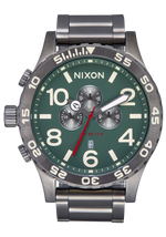 The crown on the Nixon 51-30 Chrono is located at the 9 o'clock position to prevent wrist bite when worn on the left hand, providing greater comfort during active use. This design choice allows the watch to be worn without the crown digging into the wrist, which is great if you're getting your hands dirty.