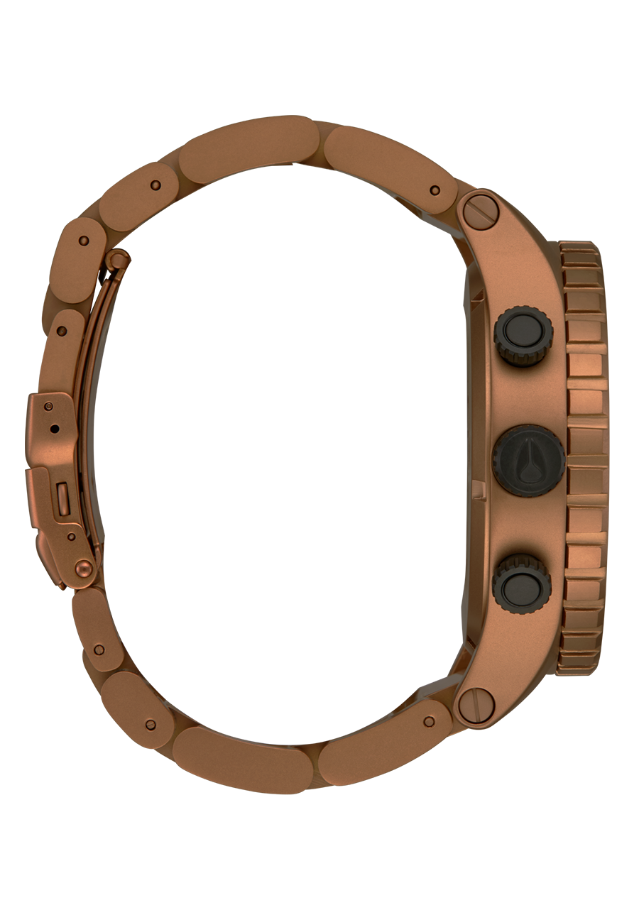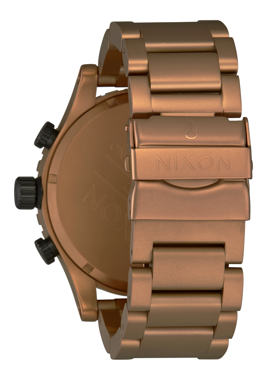 The crown on the Nixon 51-30 Chrono is located at the 9 o'clock position to prevent wrist bite when worn on the left hand, providing greater comfort during active use. This design choice allows the watch to be worn without the crown digging into the wrist, which is great if you're getting your hands dirty.