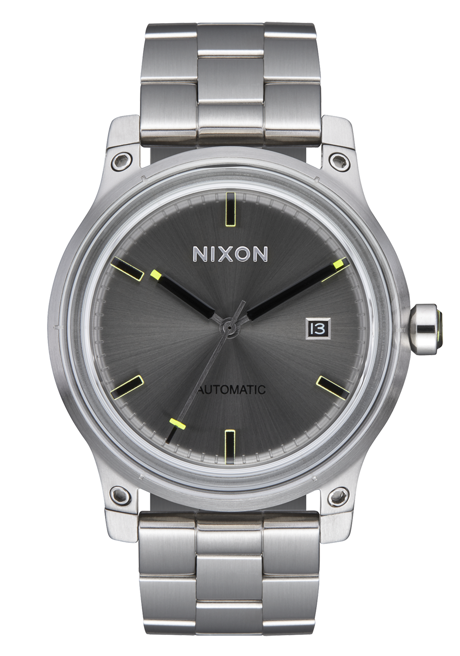 The unique two-piece design eliminates the need for a traditional caseback, while the split window gives a view of the inner workings of the automatic movement and the custom crystal shape flows seamlessly into the case with angled edges. The domed dial features LUME block indices and LUME accents on the hands for visibility even in low light conditions.