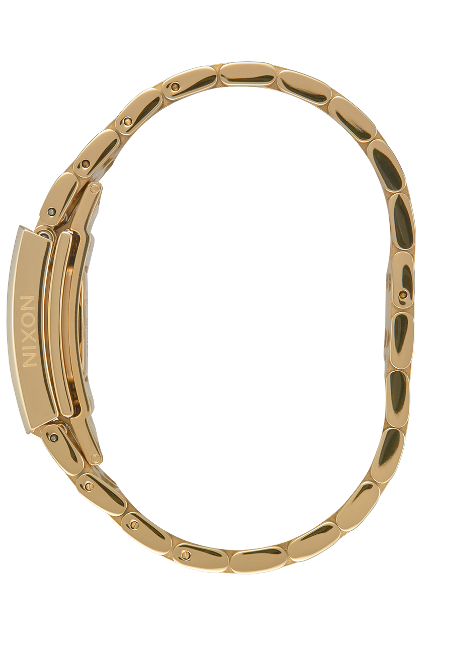 Woman wearing black leather jacket holds black leather bag with The Confidante watch in All Gold on wrist