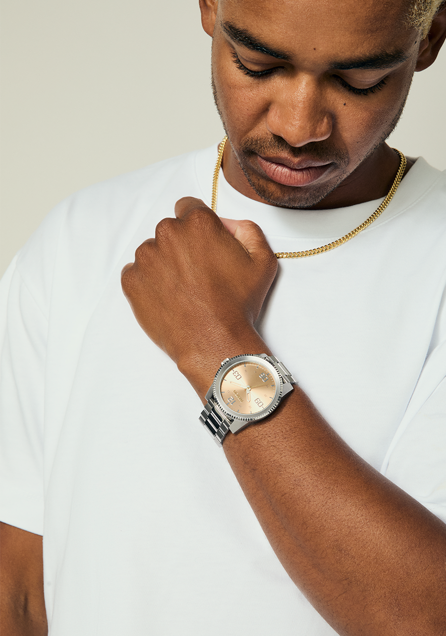 The field watch with a clear, tactical advantage. The face is protected by a recessed crystal and the oversized bezel brings out the best in rugged durability. Its functional design combined with details like faceted links that look like a mountain range when viewed from the side means the Corporal always has the high ground.