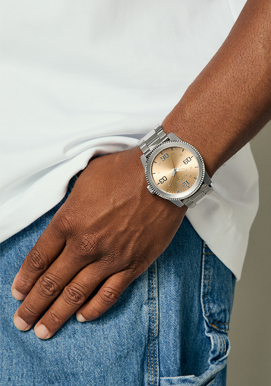 The Nixon Corporal features a 48mm custom solid stainless steel case, a solid stainless steel fixed bezel, and a hardened mineral crystal.