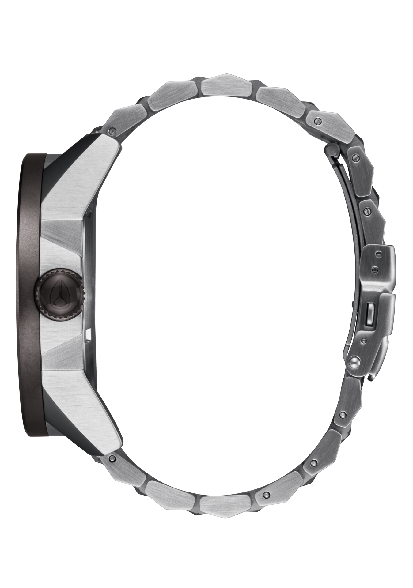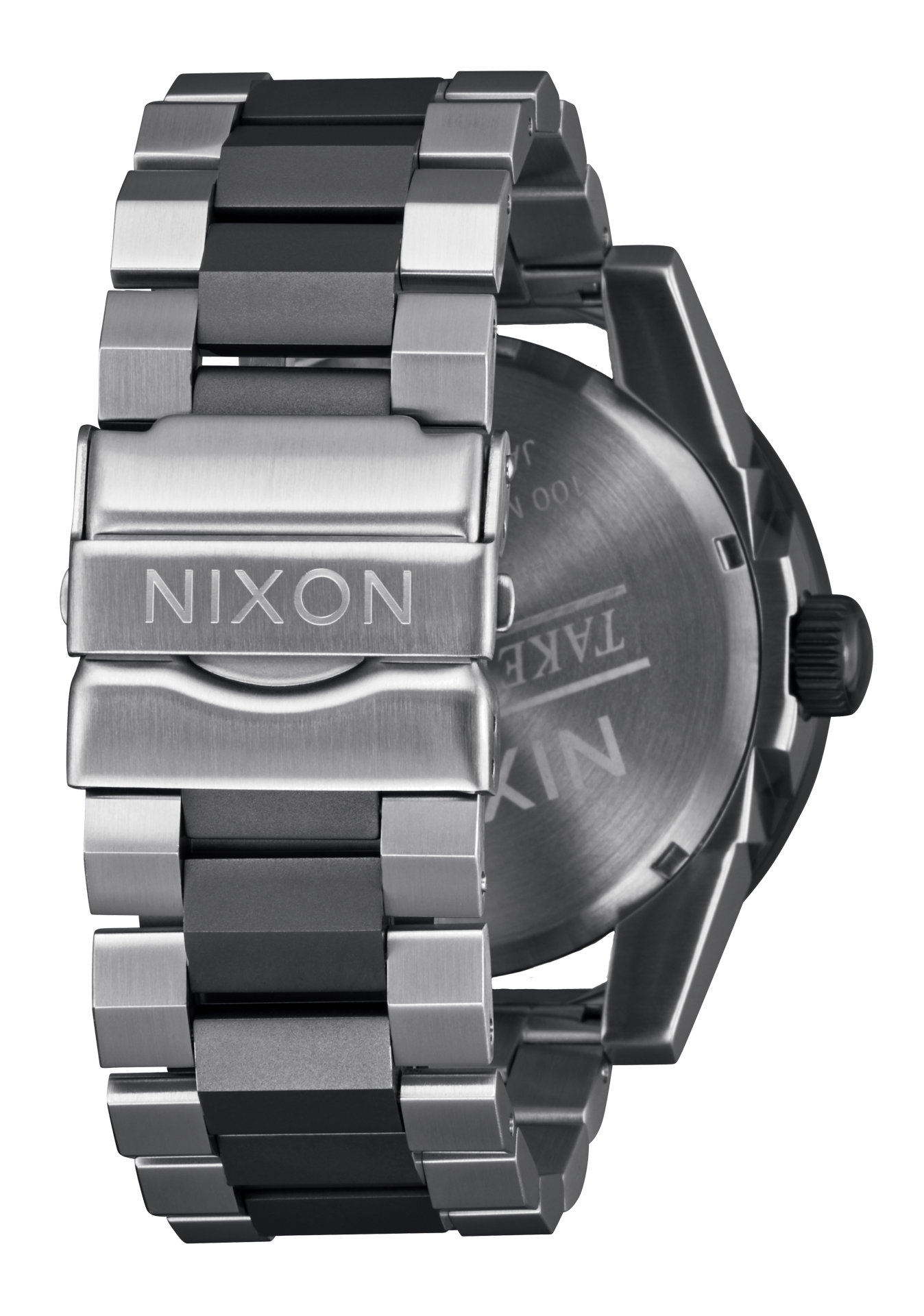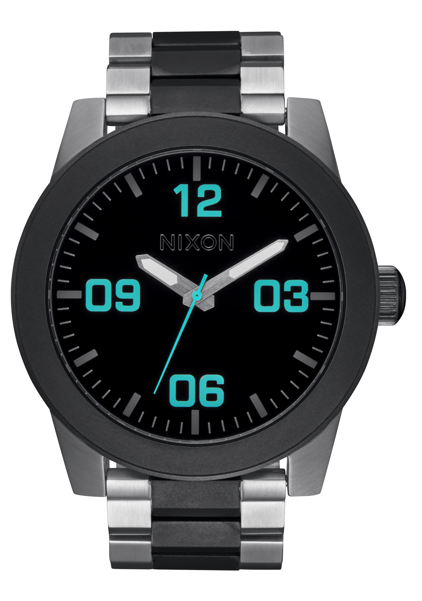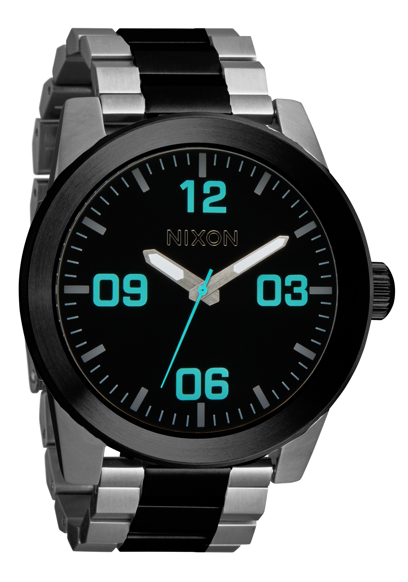 The Nixon Corporal features a 48mm custom solid stainless steel case, a solid stainless steel fixed bezel, and a hardened mineral crystal.