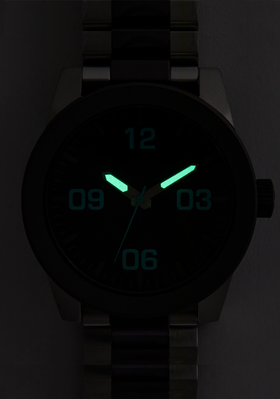 The field watch with a clear, tactical advantage. The face is protected by a recessed crystal and the oversized bezel brings out the best in rugged durability. Its functional design combined with details like faceted links that look like a mountain range when viewed from the side means the Corporal always has the high ground.