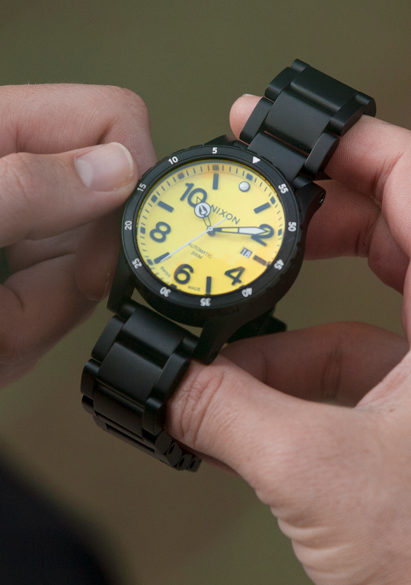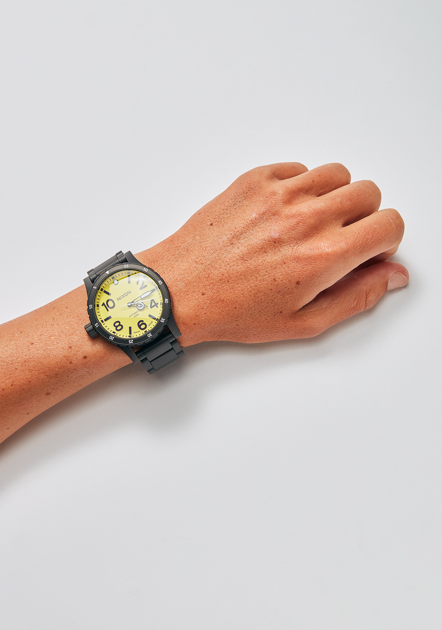 23mm custom solid stainless steel 3 link bracelet with 1.5mm hex head screw pins. enables 10mm of on-the-fly, quick-access, tool-free band adjustment. Double locking clasp closure. Alternate strap is Horween Aniline Chromexcel Black with Brushed SS deployant buckle.