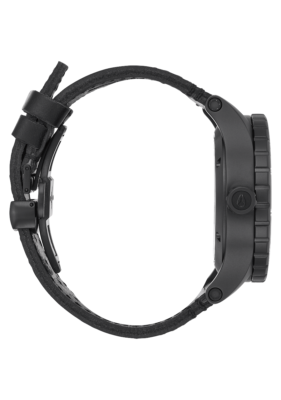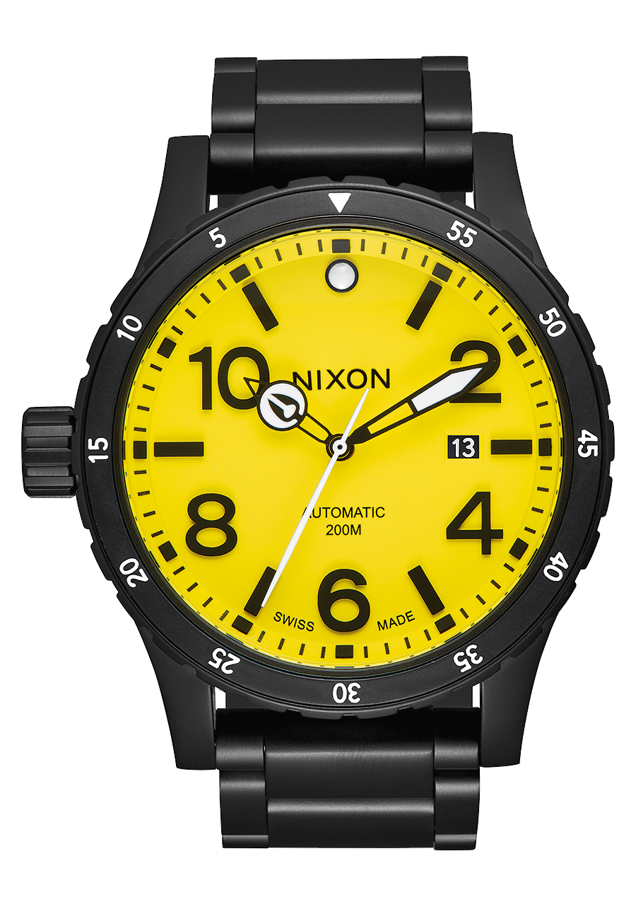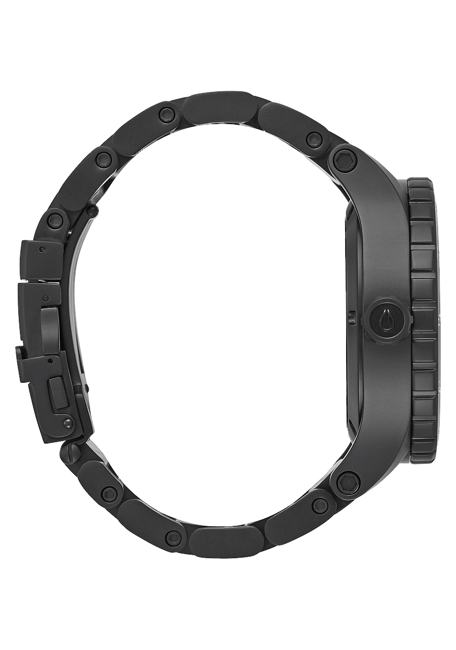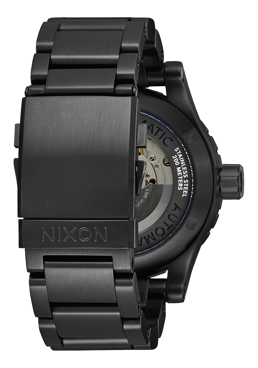 46mm, 200 meter/20 ATM custom solid stainless steel case with unidirectional rotating stainless steel bezel. IP plated stainless steel bezel insert with color filled countdown timer markings. Domed sapphire crystal with anti-glare coating on underside. Triple gasket stainless steel screw down crown at 3 hour side. Stainless steel screw down caseback with exhibition crystal showing custom engraved movement rotor. Stainless steel, 2mm hex head screw bars. Individually serialized number engraved on caseback.