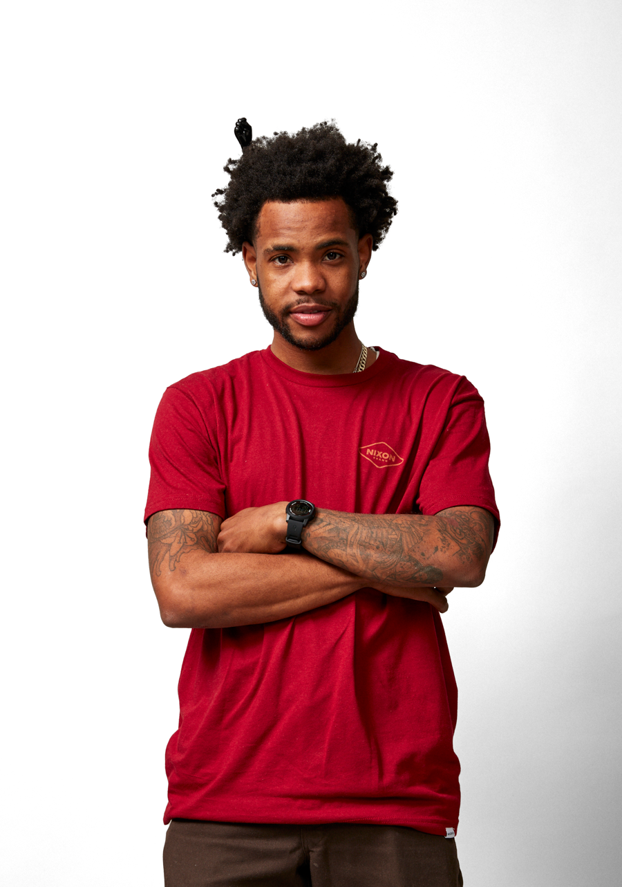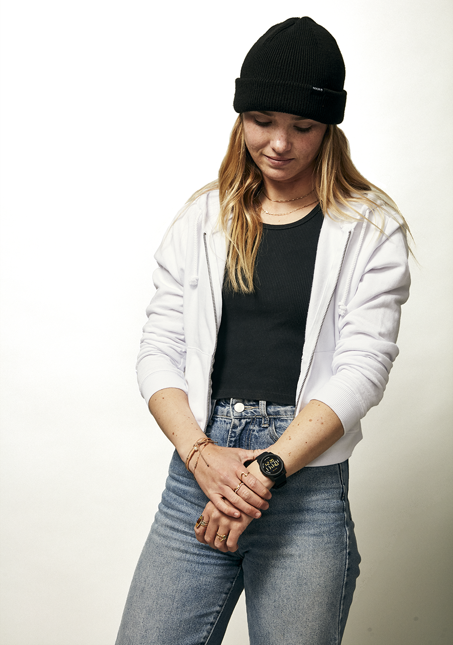 Nora Vasconcellos poses wearing orange sunglasses wearing an orange Nixon Disk Watch.