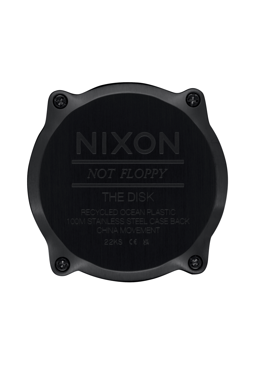 The Nixon Disk features a hardened mineral crystal. The case is made with eco-friendly recycled plastic and the band is made with silicone.
