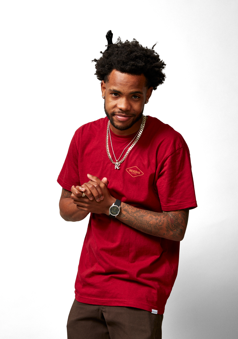 Nora Vasconcellos poses wearing orange sunglasses wearing an orange Nixon Disk Watch.