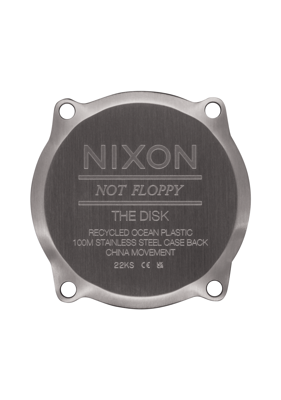 The Nixon Disk features a hardened mineral crystal. The case is made with eco-friendly recycled plastic and the band is made with silicone.
