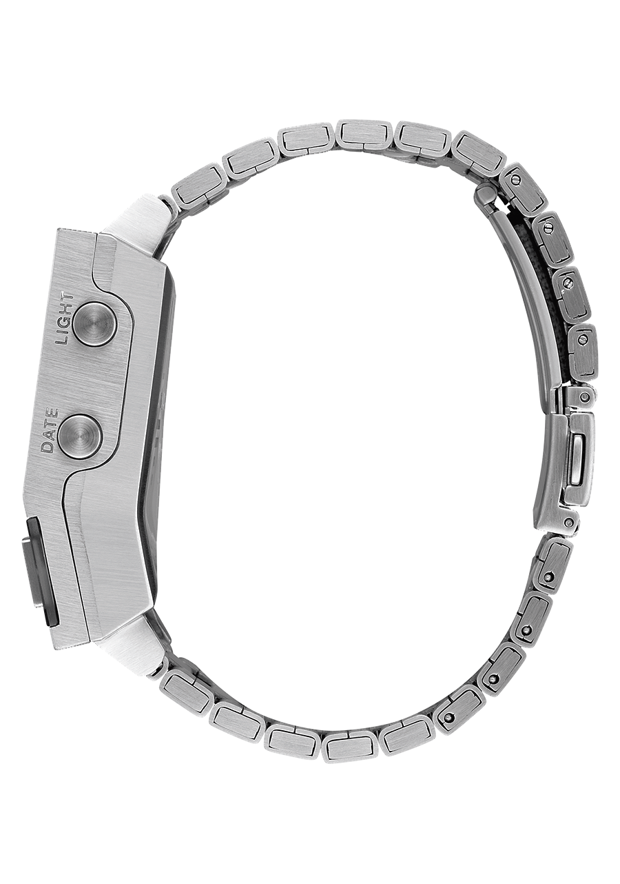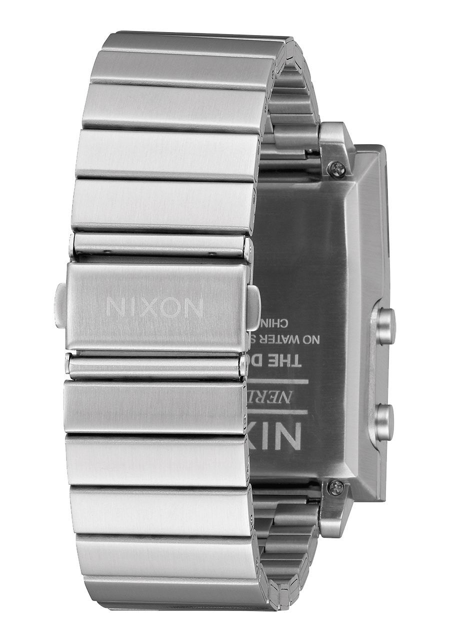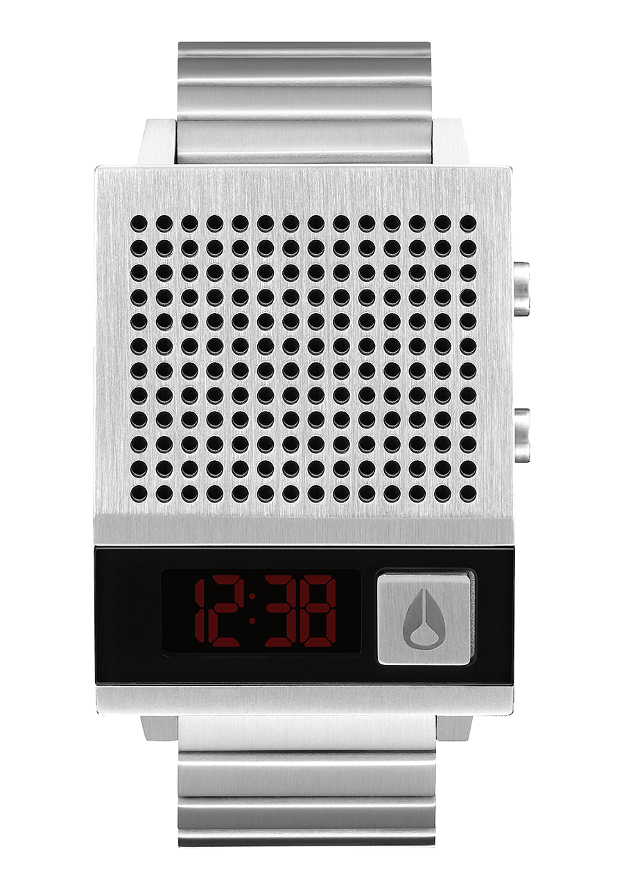 34mm custom injection molded stainless steel case with perforated stainless steel speaker cover and pushers, with micro USB charging port.
