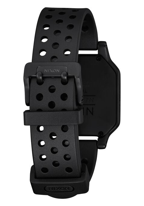 The Nixon Heat features a 38mm custom ultra-thin 8mm stainless steel case with stainless steel pushers and a hardened mineral crystal for protection. The band is a 20mm injection molded rubber strap with a perforated design, engineered for durability, breathability, and comfort. The watch is designed for maximum performance in sports, offering robust protection against impacts and water resistance up to 100 meters / 10 ATM.