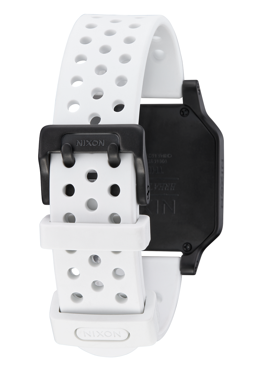 The Nixon Heat features a 38mm custom ultra-thin 8mm stainless steel case with stainless steel pushers and a hardened mineral crystal for protection. The band is a 20mm injection molded rubber strap with a perforated design, engineered for durability, breathability, and comfort. The watch is designed for maximum performance in sports, offering robust protection against impacts and water resistance up to 100 meters / 10 ATM.