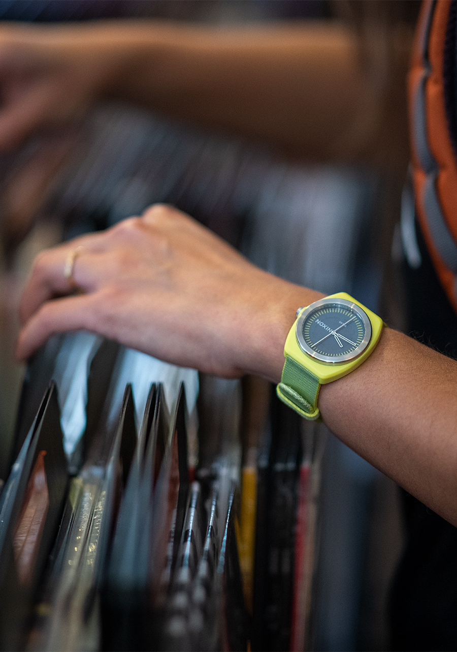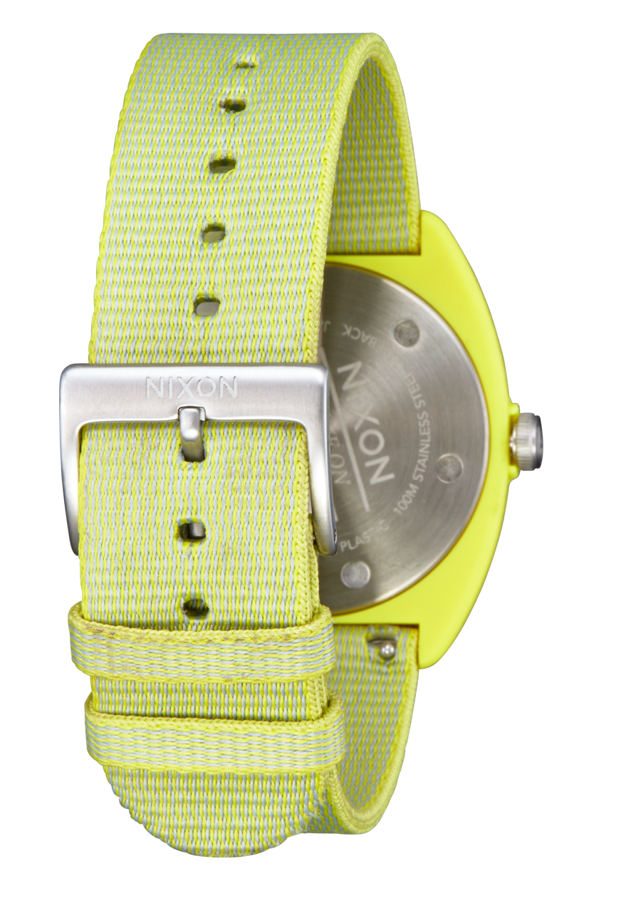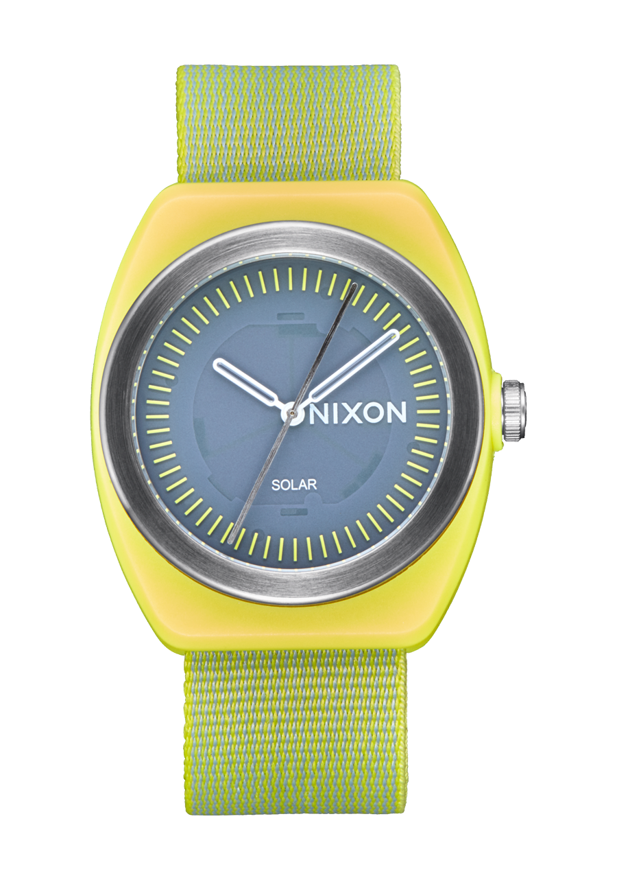 The Nixon Light-Wave watch features a 36mm case diameter made from recycled ocean plastic, with a stainless steel caseback. It includes a 20mm custom recycled ocean plastic woven strap. The dial showcases a semi-transparent dial and a unique design that highlights the solar panel within the watch face.