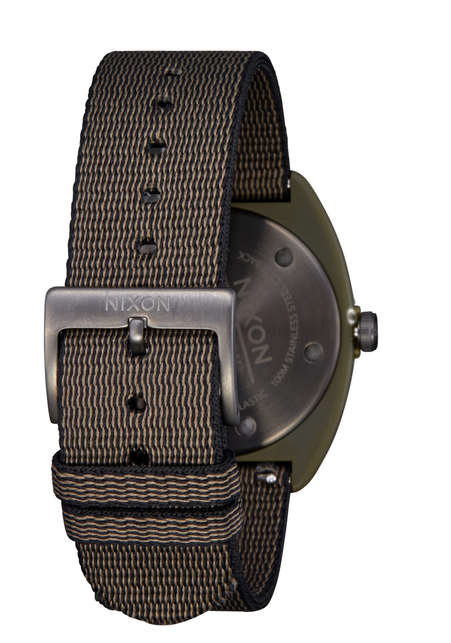 Dial includes applied stick indices and Nixon wordmark logo. Comes with wireframe hour and minute hands. Seconds hand stretches the length of the watch dial.