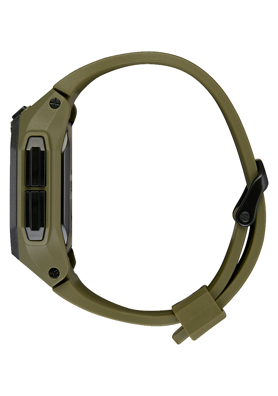 46mm custom injection molded TR-90 case with a 100 meter / 10 ATM water rating. Custom digital LCD module encased in a protective PU jacket and Poron foam padding. Comes with polycarbonate pushers located at 6 and 9 o'clock, hardened mineral crystal, stainless steel bezel, solid stainless steel screw down caseback and screw pin lugs.