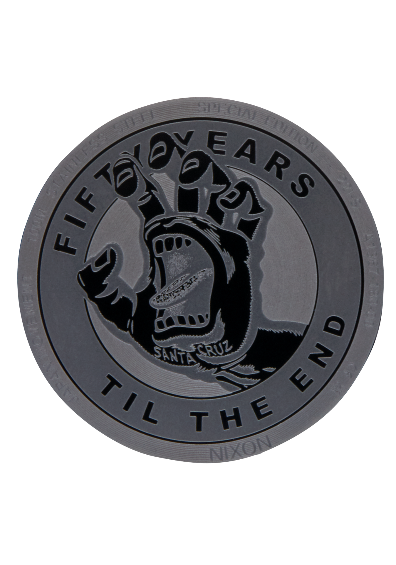Dial features custom molded hands with a Screaming Hand seconds hand, stick indices and 3D-applied Santa Cruz run-through logo.