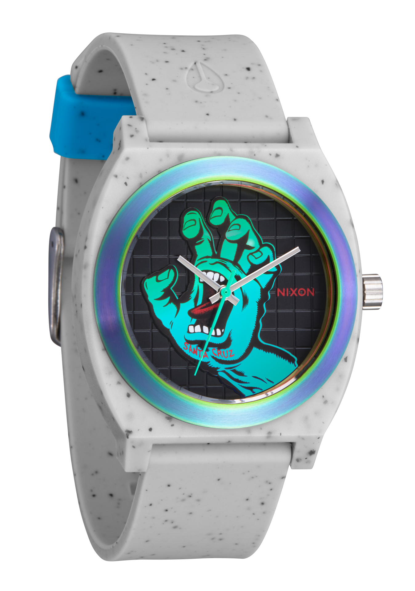 Dial features custom molded hands with a Screaming Hand seconds hand, stick indices and 3D-applied Santa Cruz run-through logo.