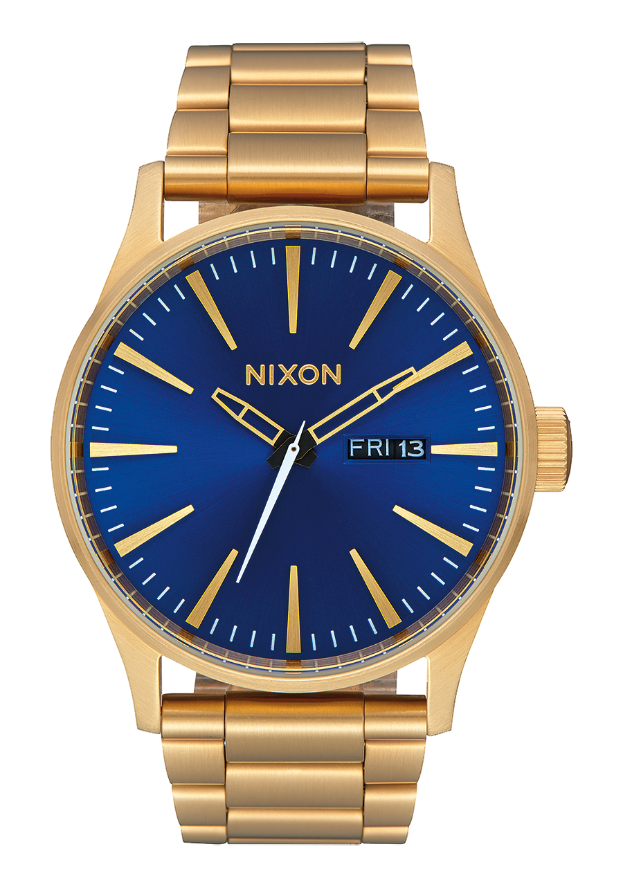 The Nixon Sentry Stainless Steel watch uses a Japanese Miyota 2305 quartz 3-hand movement and features a bilingual day and date function in English and Spanish.
