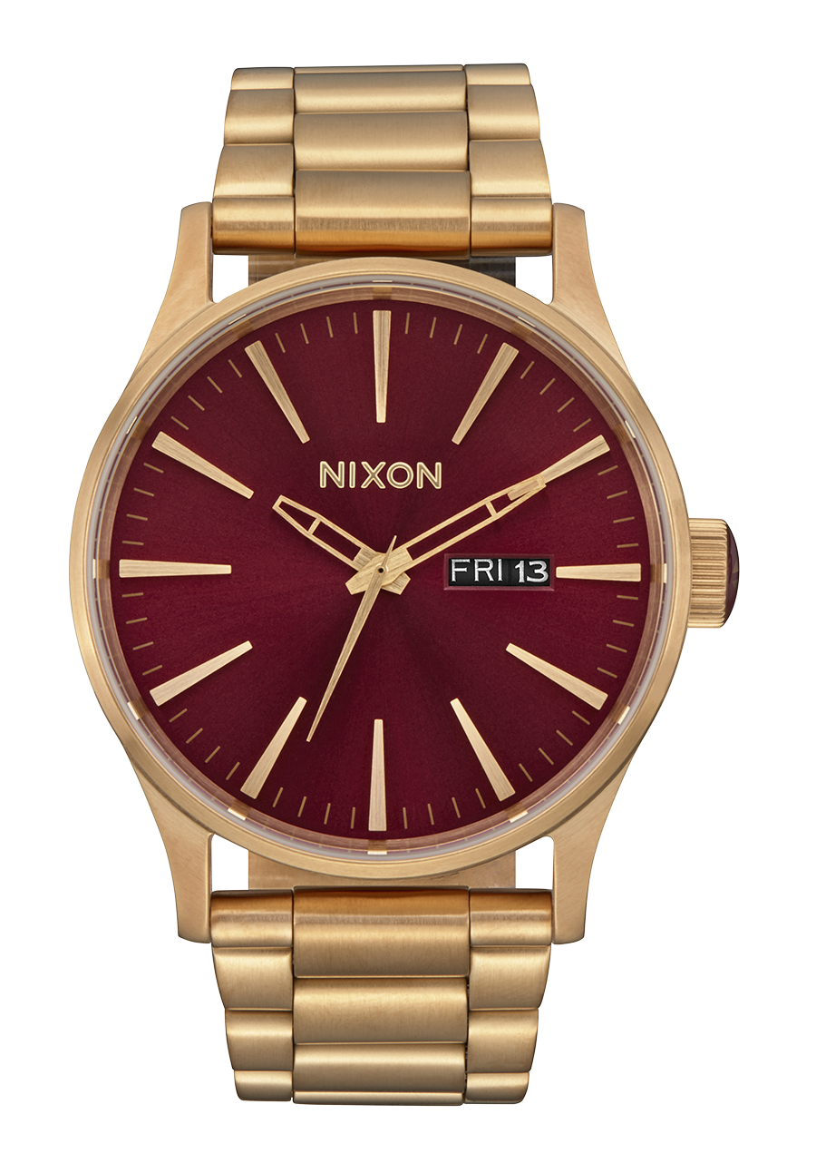 The Nixon Sentry Stainless Steel watch uses a Japanese Miyota 2305 quartz 3-hand movement and features a bilingual day and date function in English and Spanish.