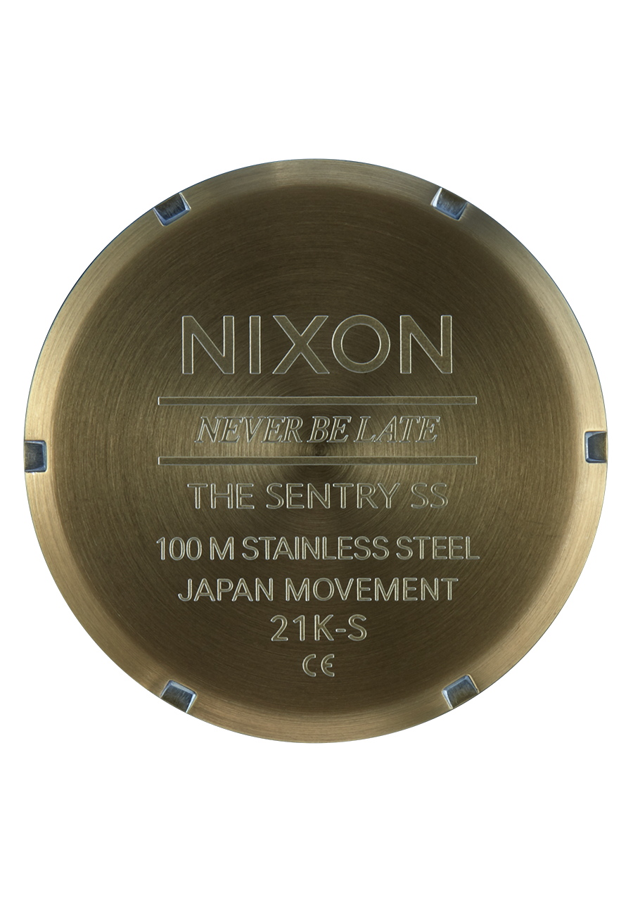 The Nixon Sentry Stainless Steel watch uses a Japanese Miyota 2305 quartz 3-hand movement and features a bilingual day and date function in English and Spanish.