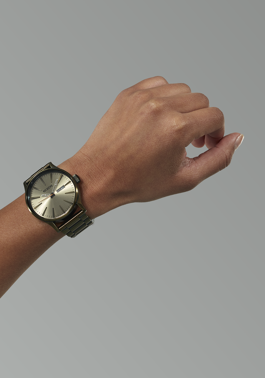 There are two ways to adjust the Sentry Stainless Steel. Smaller adjustments can be made with the micro adjuster and larger adjustments can be made by removing or adding watch links. Visit the Nixon blog to learn how to resize this watch.