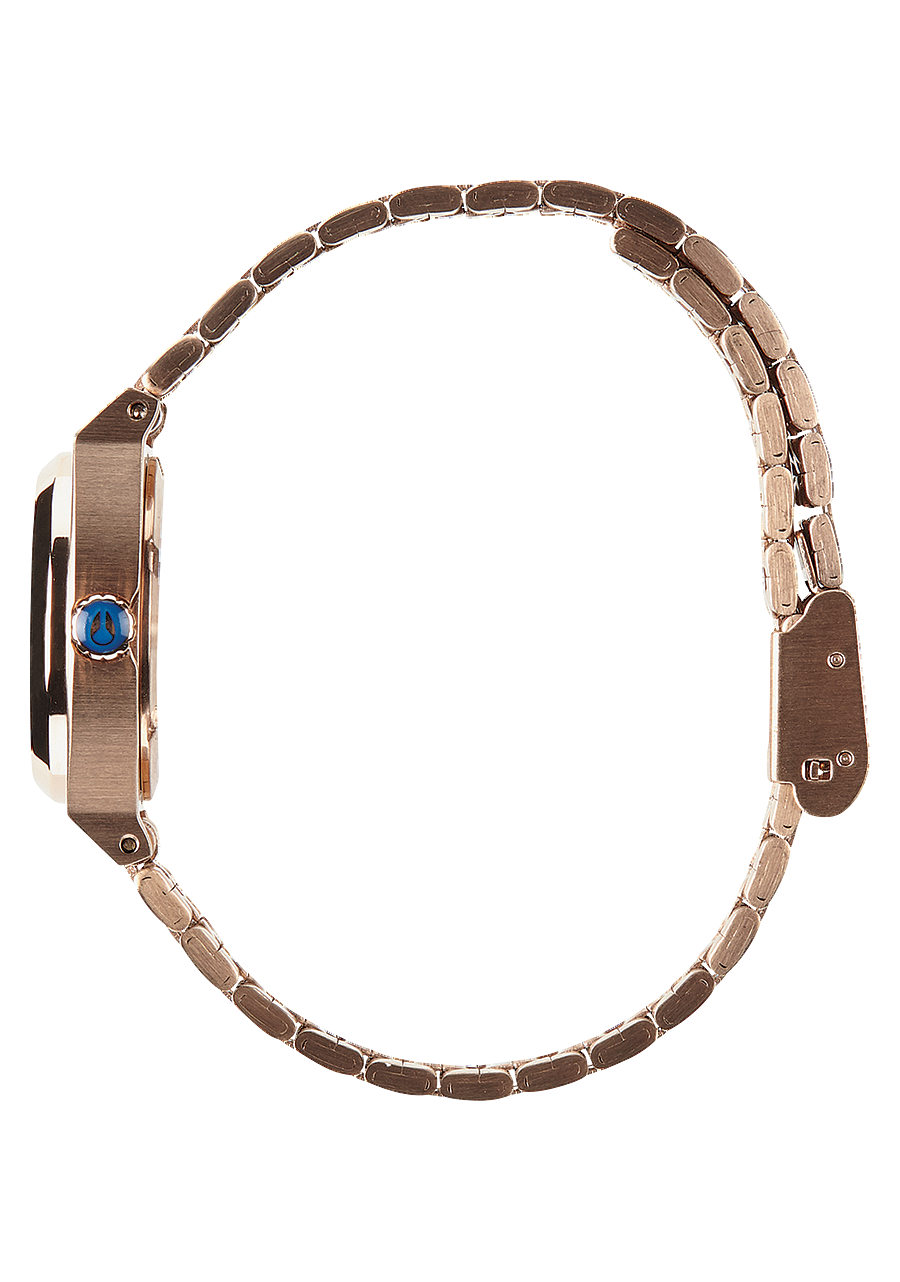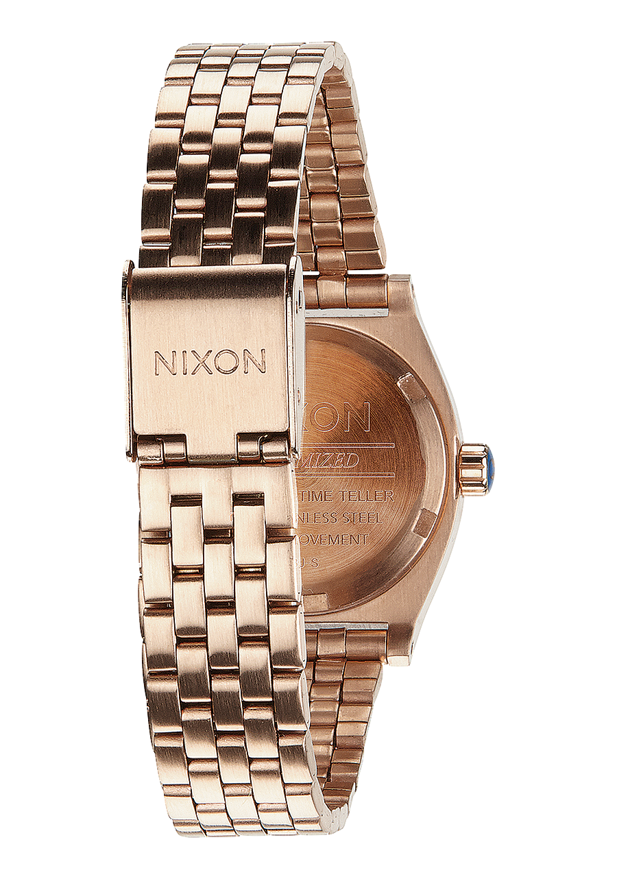 The Nixon Small Time Teller watch is water resistant with a rating of 100 meters / 10 ATM, making it suitable for activities like swimming and showering.