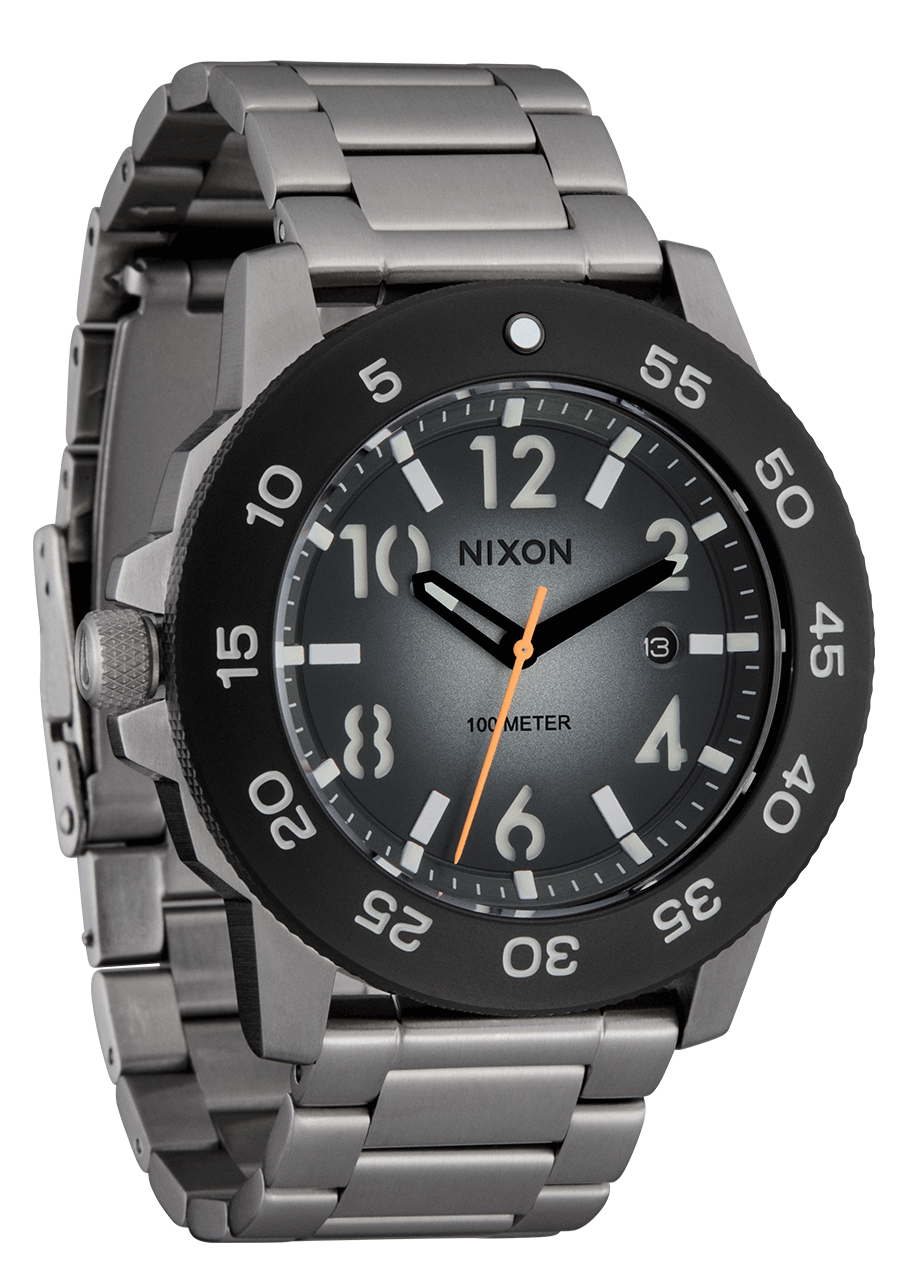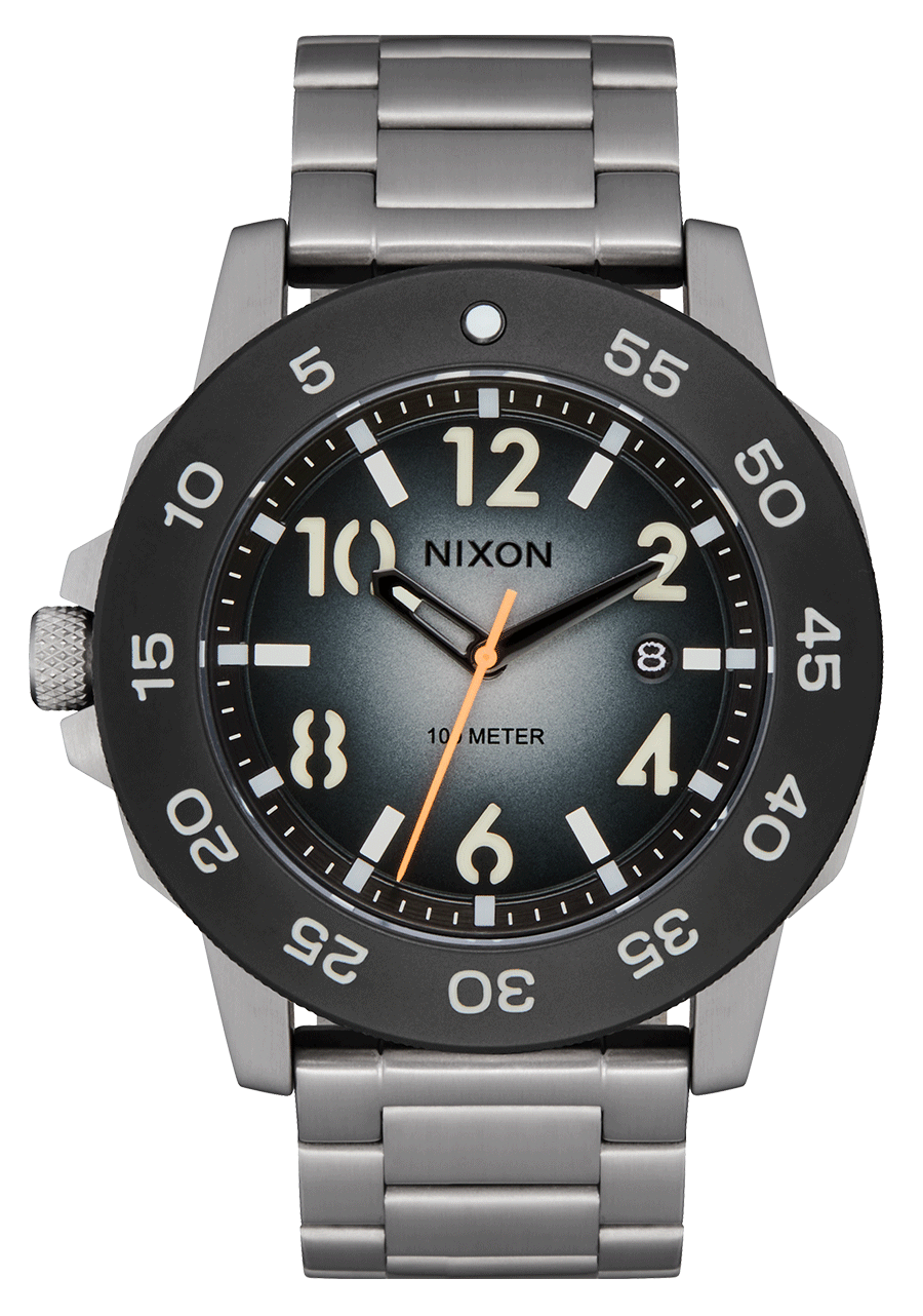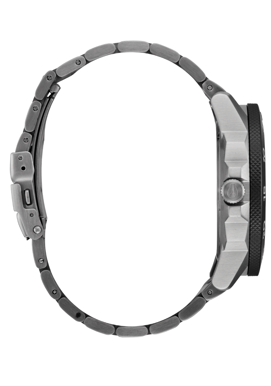 44mm stainless steel case with a unidirectional countdown protective bezel and a 100 meter / 10 ATM water rating. Comes with an applied pip in the primary indicator position, screwn down crown with a crown guard and a sapphire crystal.