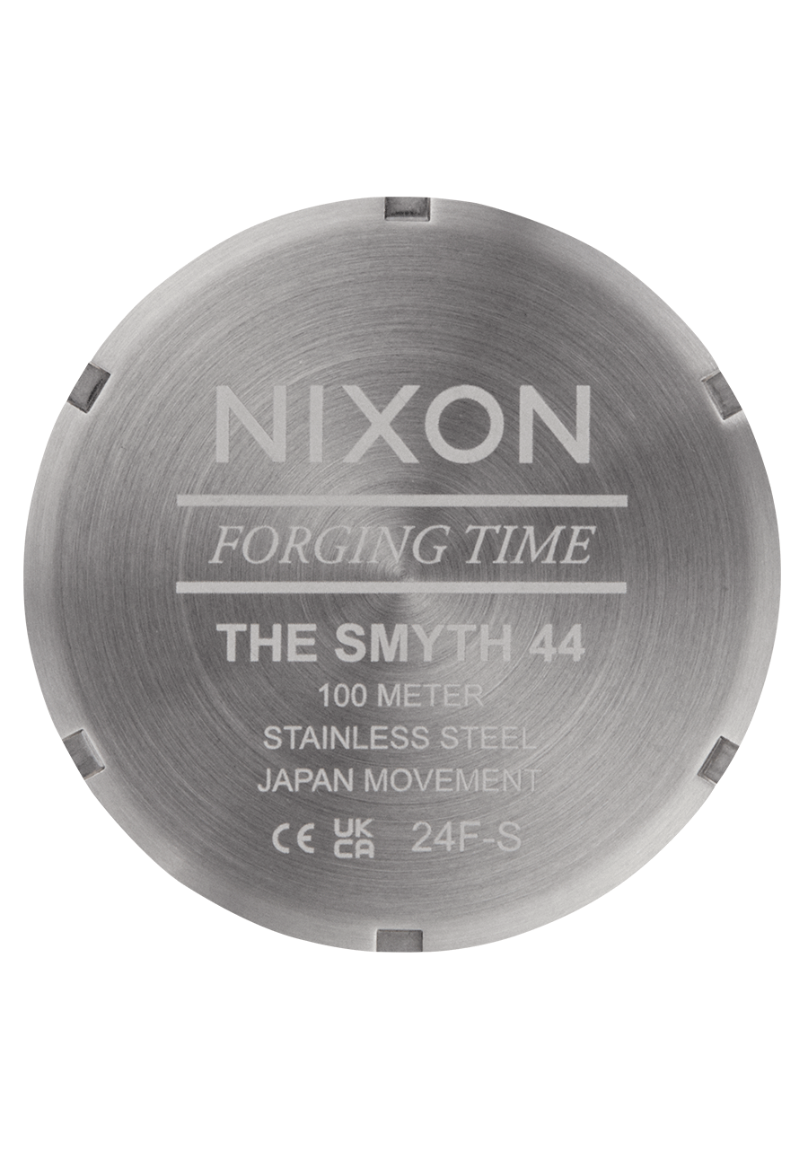 The Nixon Smyth 44 watch uses a sapphire crystal, providing superior scratch resistance and clarity.