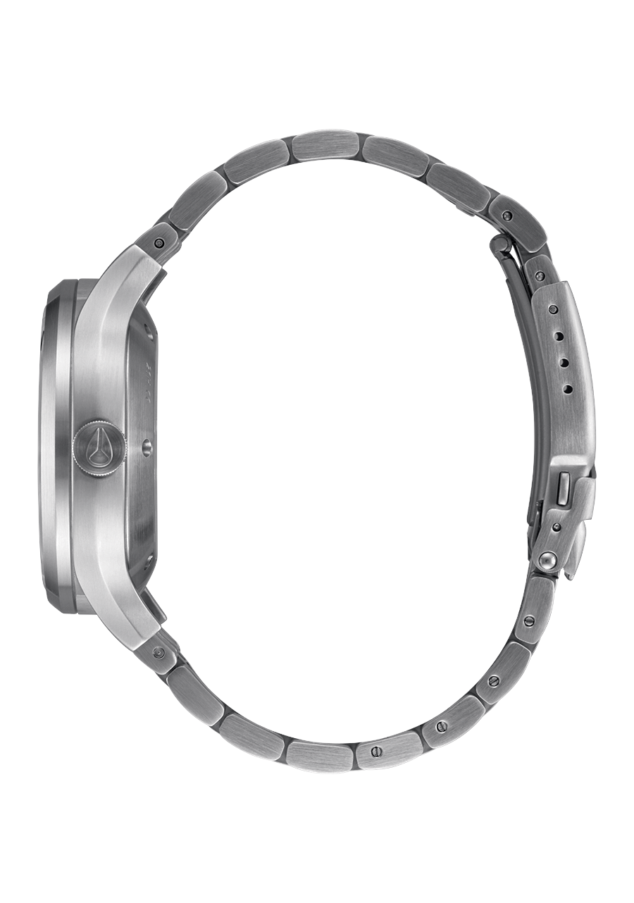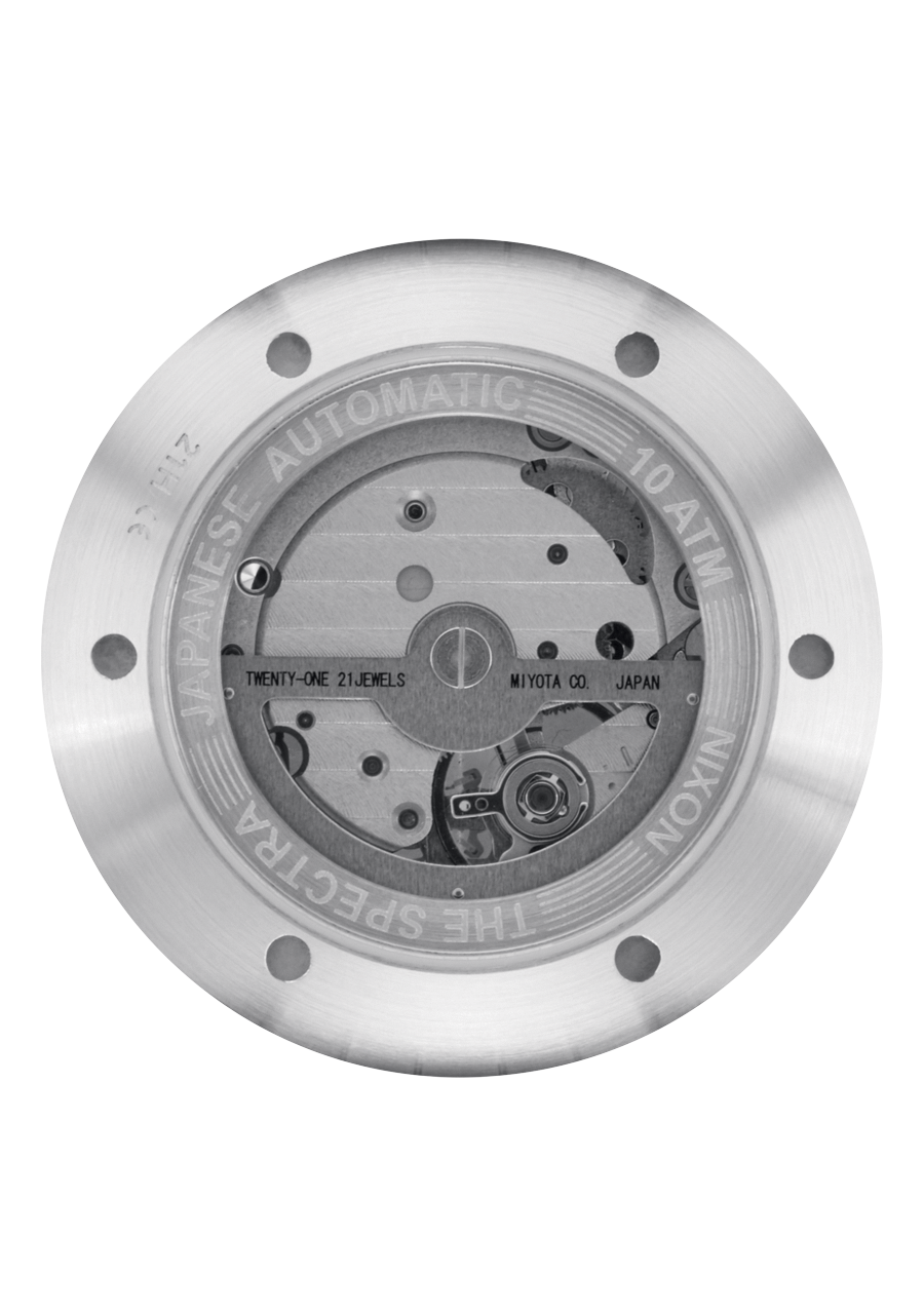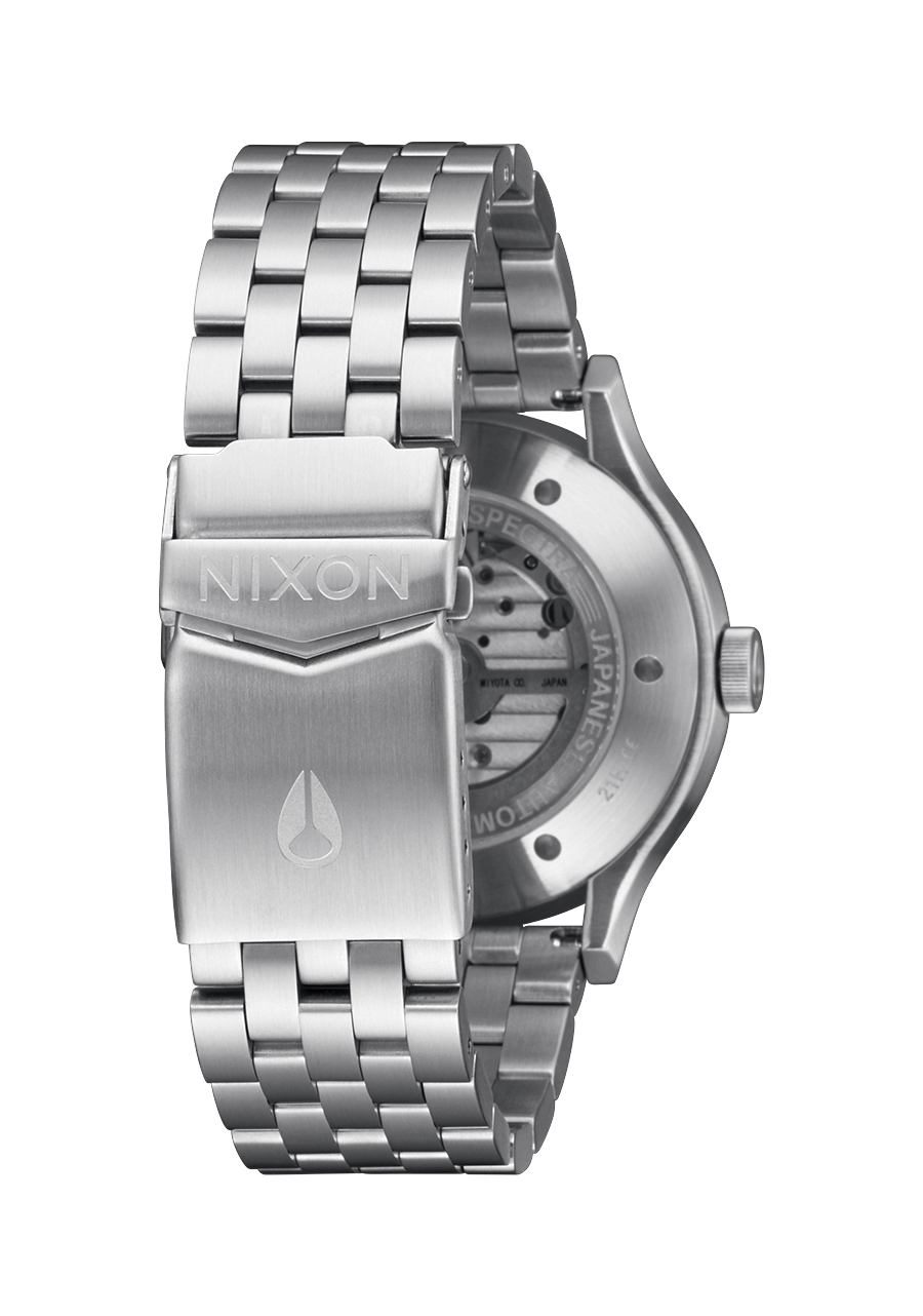 Exhibition dial exposes the automatic watch movement. The dial features applied, dimensional stick indices. The Nixon wordmark is applied to the underside of the watch crystal for additional dimension.