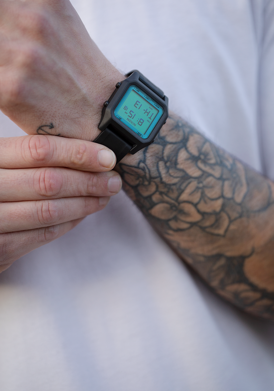 The Nixon Staple watch is highly durable for both active and everyday wear, thanks to its case made from recycled ocean plastics reinforced with custom injection-molded fiber. Additionally, it features stainless-steel pushers and a hardened mineral crystal, along with a durable rubber blend for the performance band, ensuring comfort and reliability throughout use.
