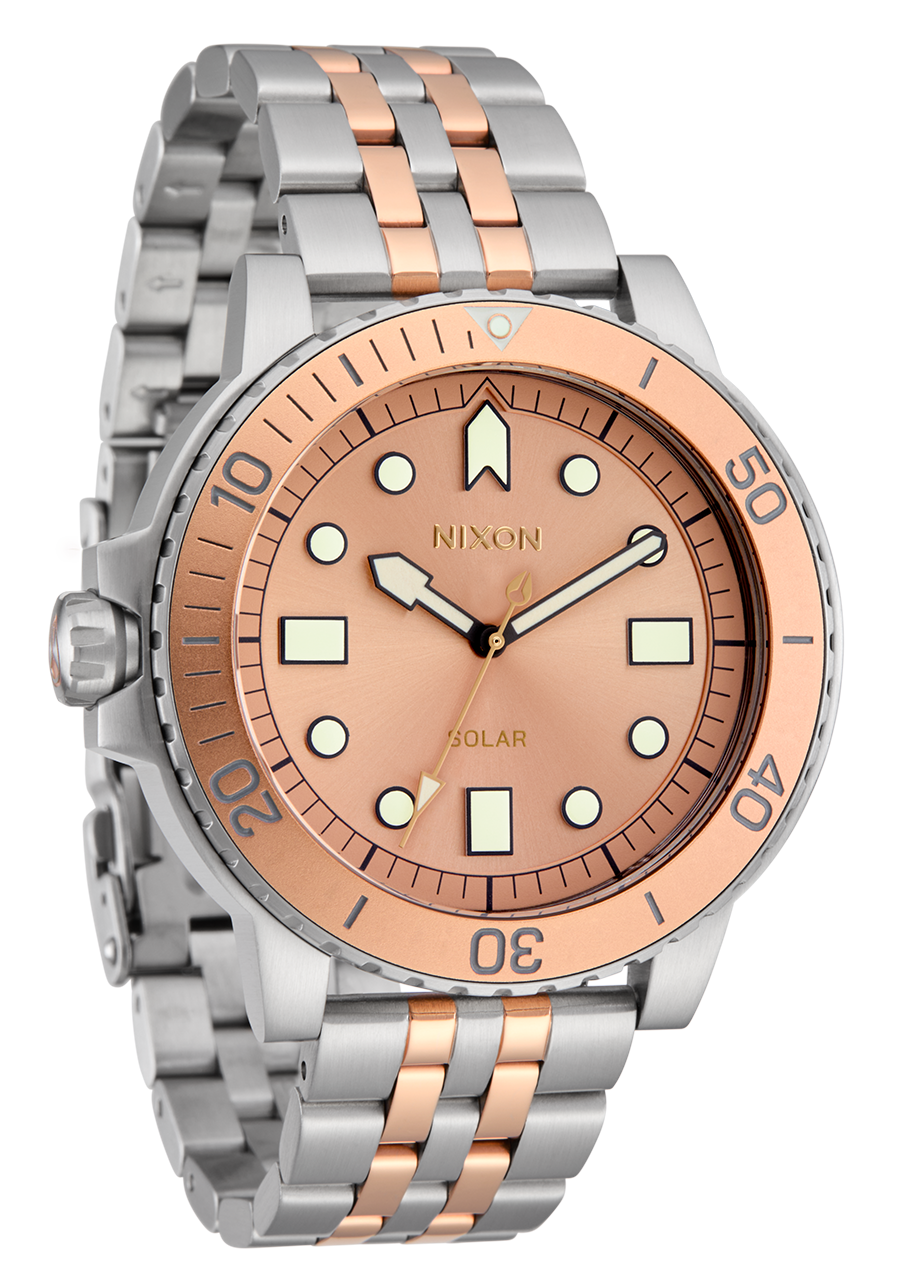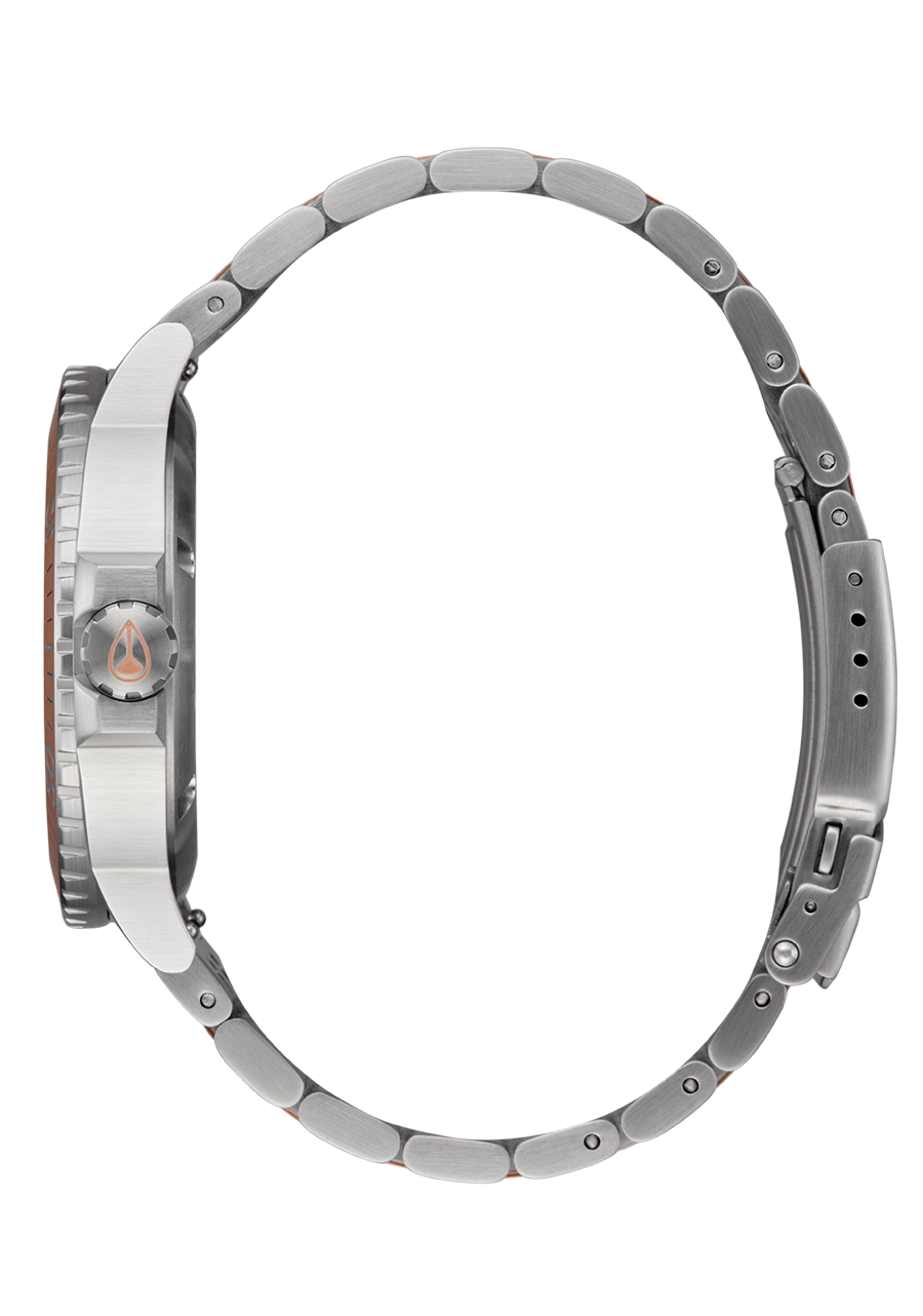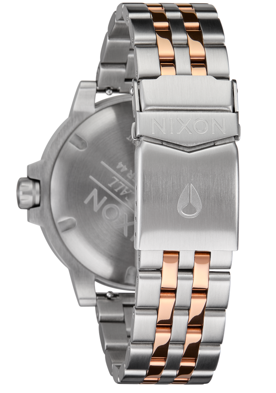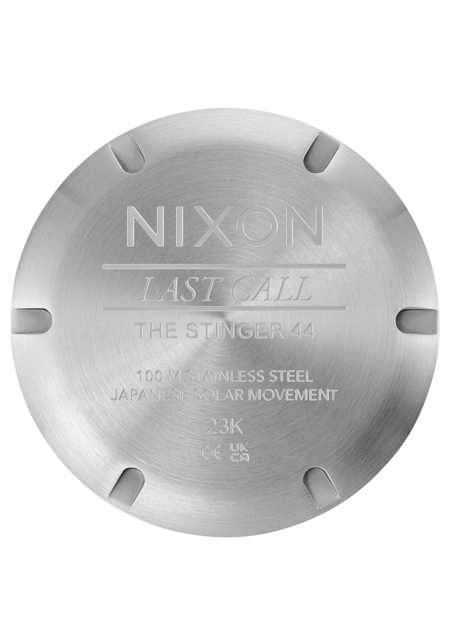 The Nixon Stinger 44 features a solid stainless steel case and a solid 5-link stainless steel bracelet with a deployant clasp. The watch is designed for durability and is water resistant to 100 meters / 10 ATM, making it suitable for everyday wear.