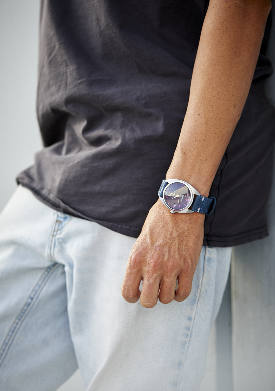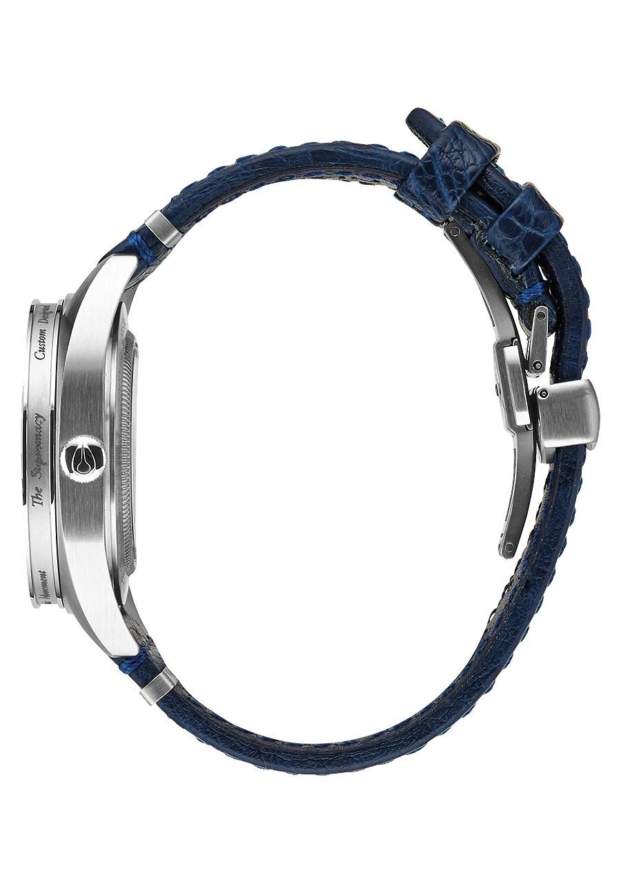 40mm custom solid stainless steel case and fixed bezel with a 100 meter / 10 ATM water rating. Case has a scratch resistant coating and the bezel has sidewall engraving. Includes a triple gasket crown with knurling texture detail and a domed sapphire crystal with antiglare treatment on the underside of the crystal. Each stainless steel screwn down caseback is individually numbered and has a hardened mineral crystal window and spring pin lugs.