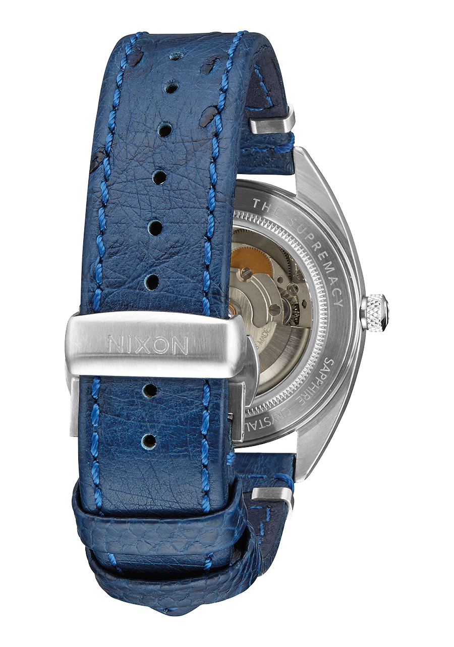 The Nixon Supremacy case is made from custom solid stainless steel. Both a stainless steel bracelet and a Horween leather strap are included.