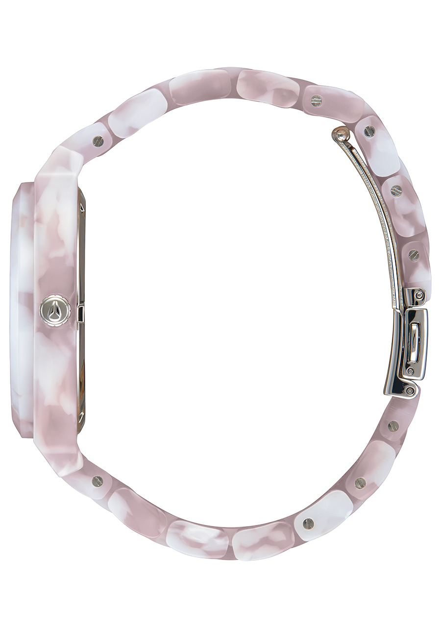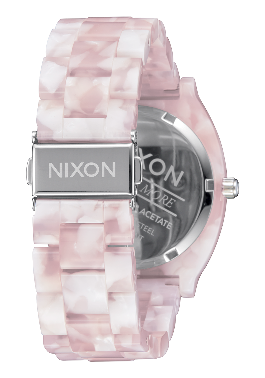 The Time Teller Acetate features a custom handmade acetate case and a 20mm custom handmade acetate 3-link bracelet. Acetate is a durable material that is lightweight and more likely to bend and rebound than break compared to other plastics due to its less rigid nature.