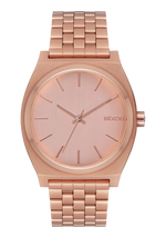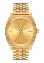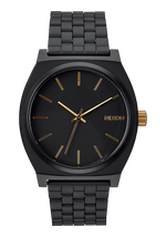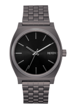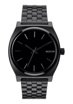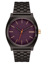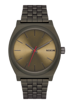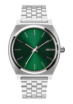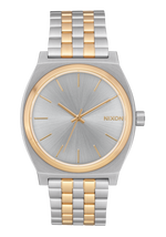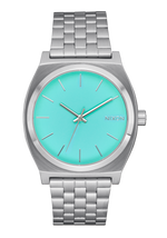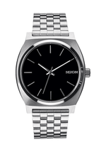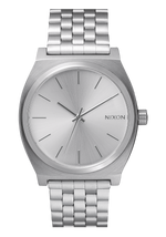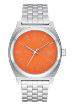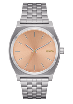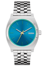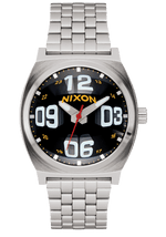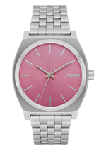 The Nixon Time Teller watch features a solid stainless steel case and a stainless steel bracelet, making it durable for daily wear and a hardened mineral crystal for added protection. The stainless steel case and bracelet provide protection against daily wear and tear, ensuring longevity and reliability.