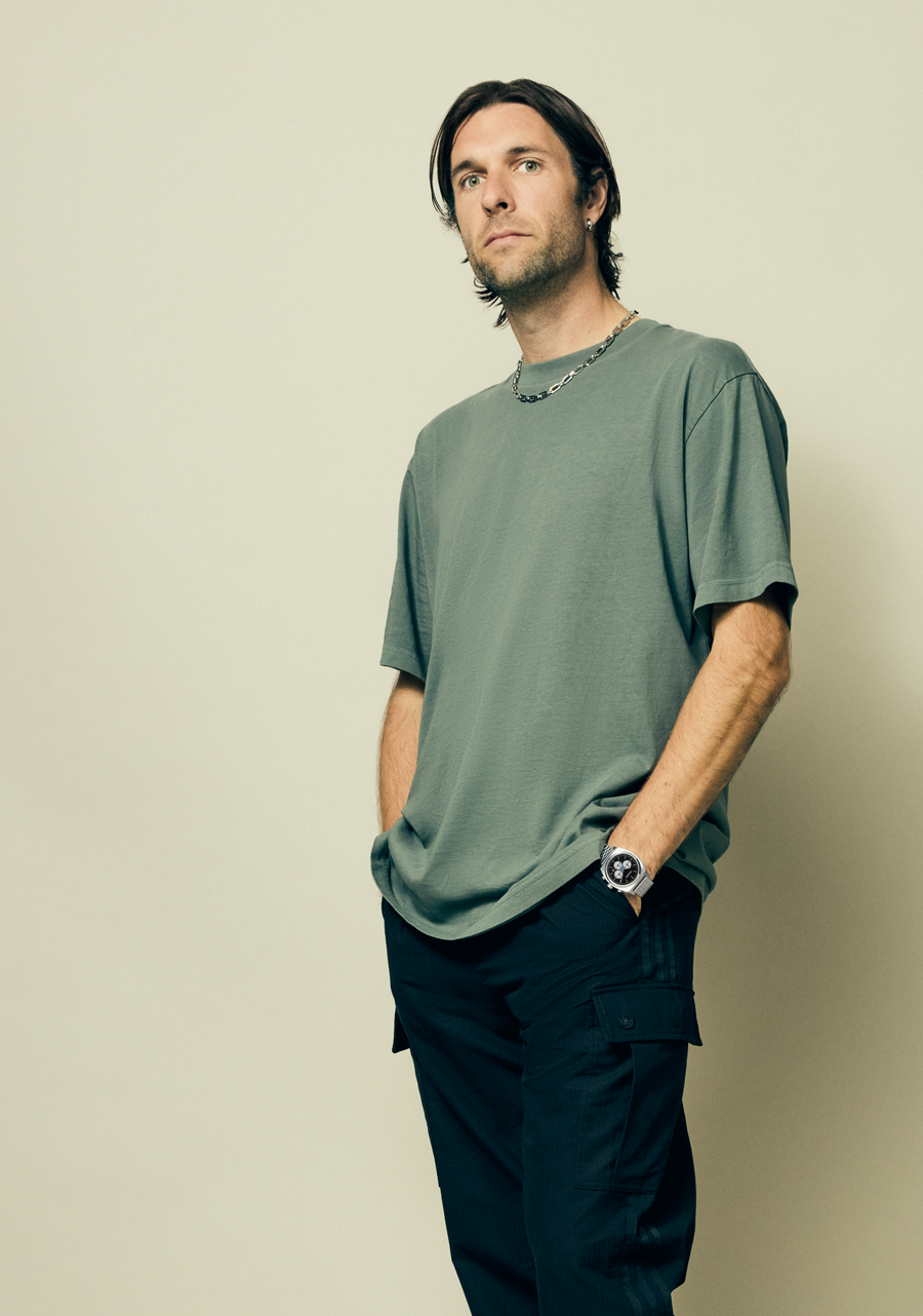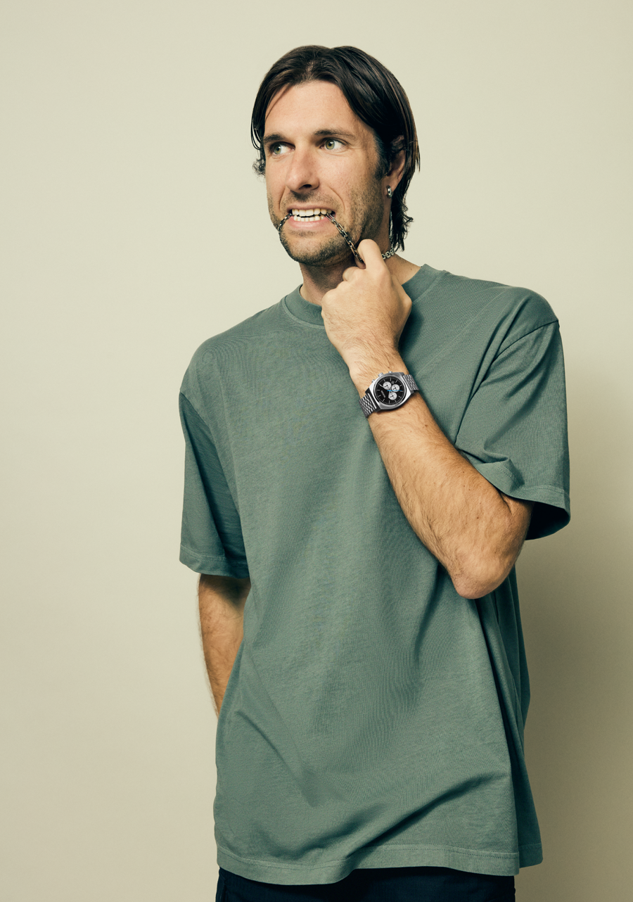 The main second hand tracks chronograph seconds. 2 o’clock subdial tracks 24-hour time. The 6 o’clock subdial tracks seconds. The 10 o’clock subdial tracks chronograph minutes.