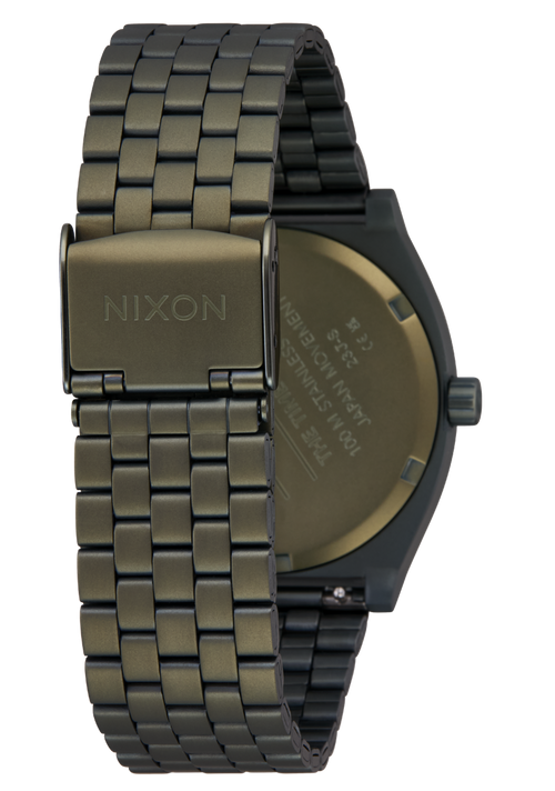 The Nixon Time Teller watch features a solid stainless steel case and a stainless steel bracelet, making it durable for daily wear and a hardened mineral crystal for added protection. The stainless steel case and bracelet provide protection against daily wear and tear, ensuring longevity and reliability.
